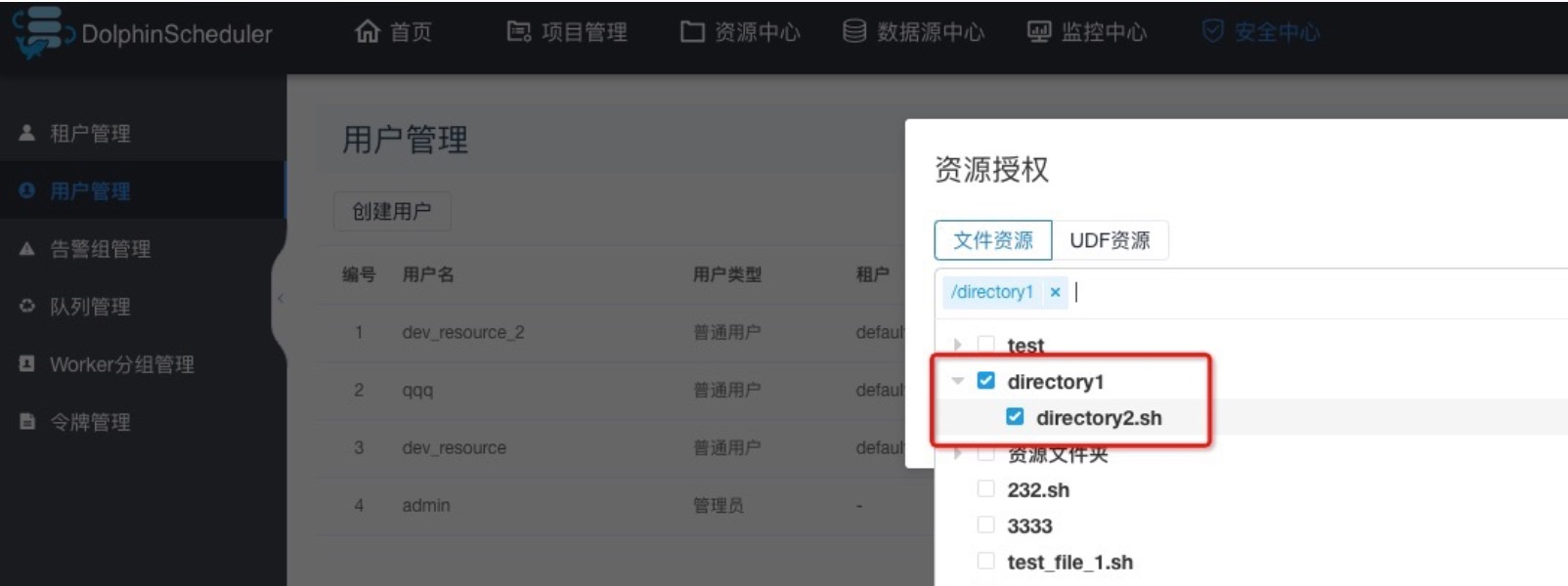 xingchun-chen opened a new issue #2089: [dev-resource-tree]View authorized file resources, only show directories, and the directory tree is incorrect URL: https://github.com/apache/incubator-dolphinscheduler/issues/2089 1.给用户授权文件/directory1/directory2.sh  2.查看用户授权文件,只显示目录/directory1,且目录树中/directory1下没有文件directory2.sh,directory2.sh文件显示在一级目录中。  **Branch** -[dev-resource-tree]