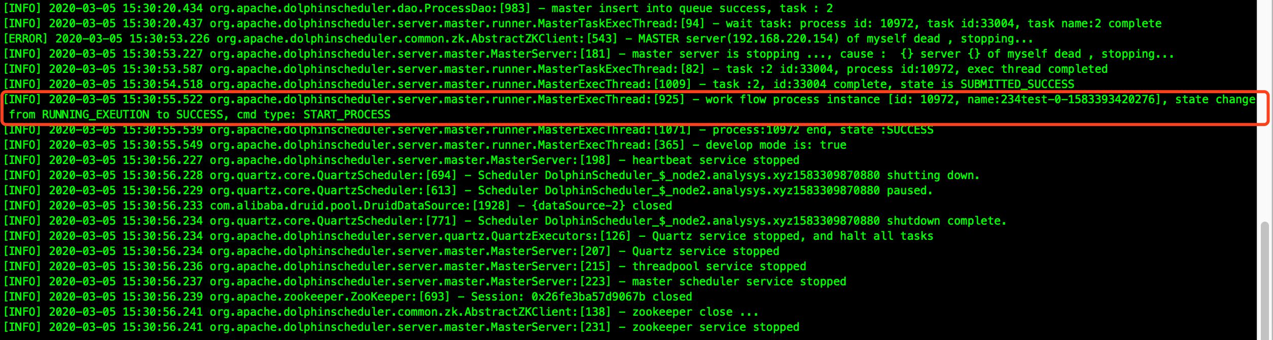 lenboo opened a new issue #2091: [BUG] work flow state is success when master server down. URL: https://github.com/apache/incubator-dolphinscheduler/issues/2091 *For better global communication, please give priority to using English description, thx! * **Describe the bug** master would change the work flow state wrong on the situation: 1. start a work flow, and tasks state are submit success. 2. master M_A cannot connect to zookeeper 3. the other masters(M_B) make the failover of the lost master M_A 4. master M_A would change the work flow state from running to success. error logs:  **Which version of Dolphin Scheduler:** -[1.2.0]