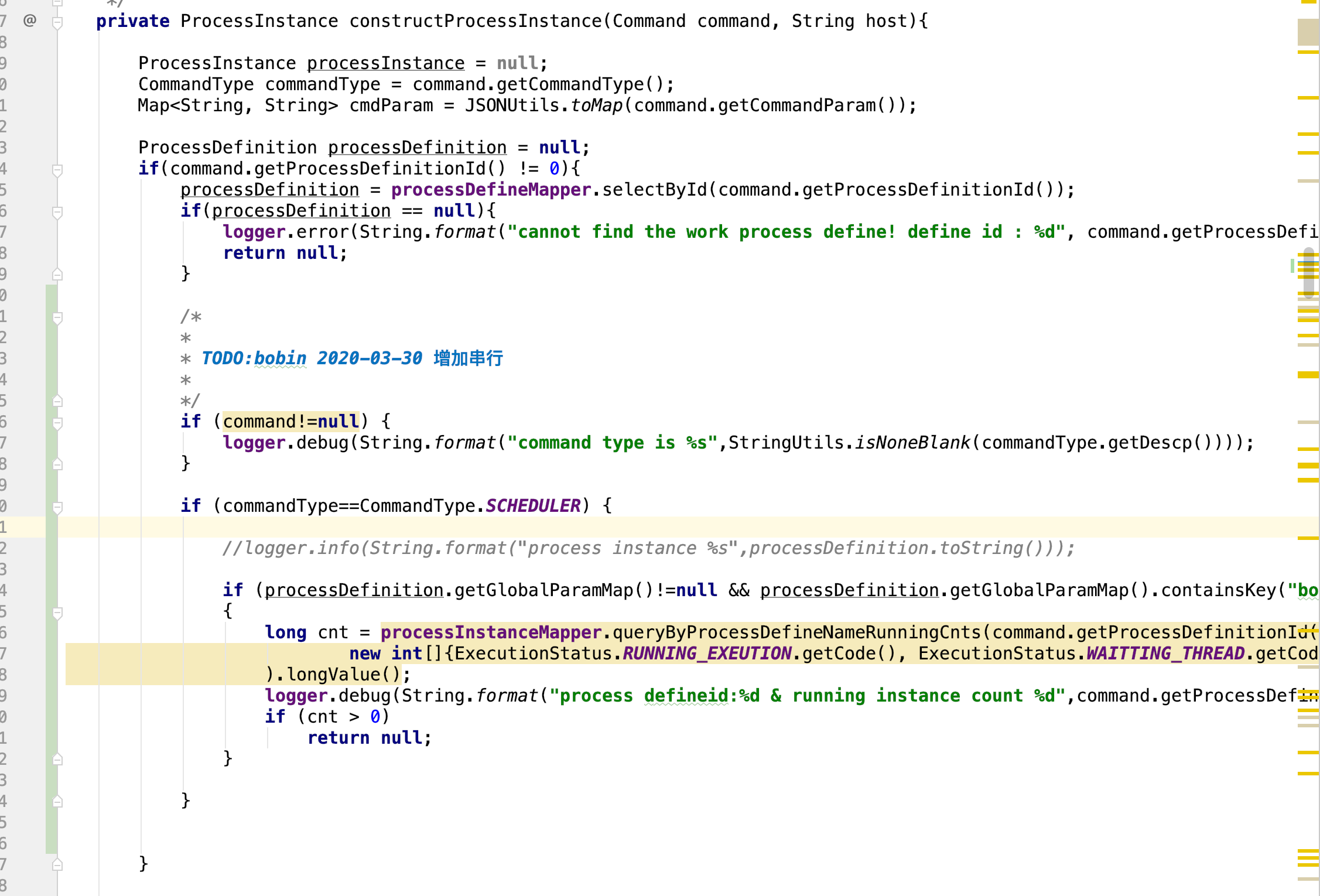 boying52 opened a new issue #2352: [QUESTION] about concurrency processinstance URL: https://github.com/apache/incubator-dolphinscheduler/issues/2352 i want to adjust program code for concurrence is disable, adjust follow place: 1、org/apache/dolphinscheduler/dao/mapper/ProcessInstanceMapper.java add: Long queryByProcessDefineNameRunningCnts(@Param("processDefinitionId") int processDefinitionId,@Param("states") int[] statusArray); 2、org/apache/dolphinscheduler/dao/mapper/ProcessInstanceMapper.xml add: <select id="queryByProcessDefineNameRunningCnts" resultType="java.lang.Long"> SELECT count(*) FROM t_ds_process_instance instance WHERE instance.process_definition_id=#{processDefinitionId} and instance.state in <foreach collection="states" index="index" item="i" open="(" separator="," close=")"> #{i} </foreach> </select> 3、org/apache/dolphinscheduler/dao/ProcessDao.java in private ProcessInstance constructProcessInstance(...) Add: /* * * TODO:bobin 2020-03-30 增加串行 * */ if (command!=null) { logger.debug(String.format("command type is %s",StringUtils.isNoneBlank(commandType.getDescp()))); } if (commandType==CommandType.SCHEDULER) { //logger.info(String.format("process instance %s",processDefinition.toString())); if (processDefinition.getGlobalParamMap()!=null && processDefinition.getGlobalParamMap().containsKey("boying-seq")) { long cnt = processInstanceMapper.queryByProcessDefineNameRunningCnts(command.getProcessDefinitionId(), new int[]{ExecutionStatus.RUNNING_EXEUTION.getCode(), ExecutionStatus.WAITTING_THREAD.getCode(), ExecutionStatus.WAITTING_DEPEND.getCode()} ).longValue(); logger.debug(String.format("process defineid:%d & running instance count %d",command.getProcessDefinitionId(),cnt)); if (cnt > 0) return null; } } }