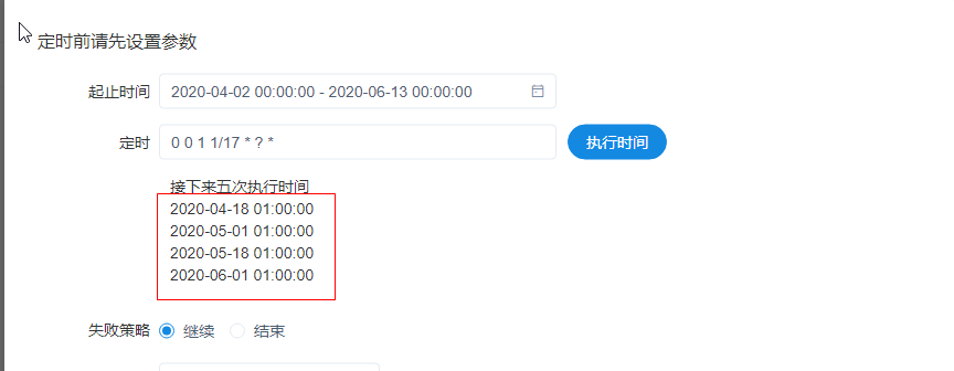 marrycheck opened a new issue #2358: [BUG] Scheduled task execution time error URL: https://github.com/apache/incubator-dolphinscheduler/issues/2358 **Describe the bug** In the task timing scheduling, if the task time interval spans months, the first execution time of the task in each month is No. 1, which does not meet the timing scheduling cycle. **To Reproduce** Steps to reproduce the behavior, for example: 1. Set task execution time range:2020-04-02 00:00:00 - 2020-06-013 00:00:00 2. Set timed expression:Set timed expression 3. Then,click the execution-time button **Screenshots** If applicable, add screenshots to help explain your problem.  **Which version of Dolphin Scheduler:** -[1.2.0]