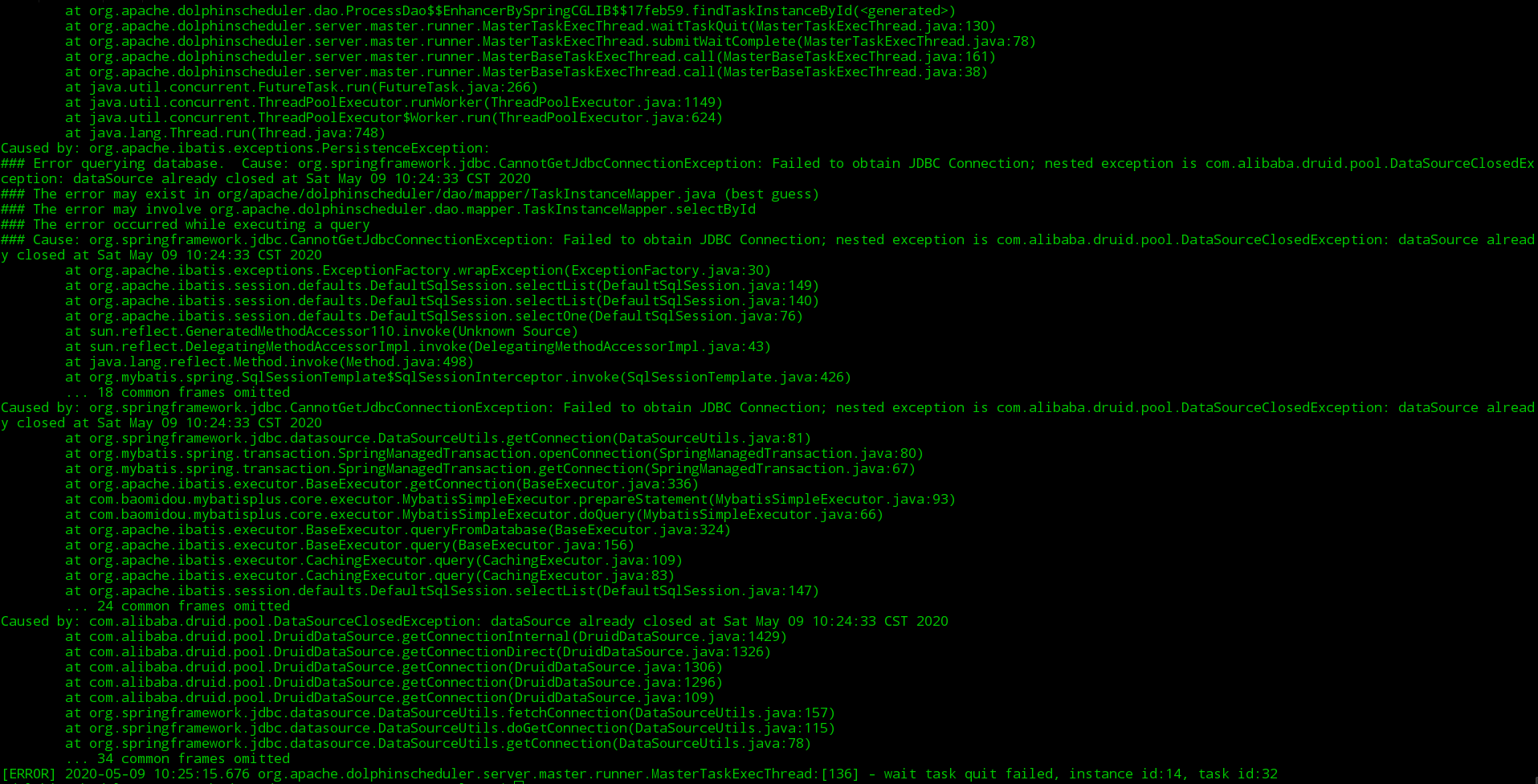*For better global communication, please give priority to using English description, thx! * **Describe the bug** When I start the DS service, the logs size in logs directory rises rapidly to almost 20G, so I can't start DS, because this must not be normal. The error info shows that there is a JDBC Connection exception with druid, as I know so far, the druid setting in DS is default, I don't know the reason result in this problem. Thanks! **To Reproduce** Steps to reproduce the behavior, for example: `sh ./bin/start-all.sh` **Screenshots**  **Which version of Dolphin Scheduler:** -[1.2] ---------------------------------------------------------------- This is an automated message from the Apache Git Service. To respond to the message, please log on to GitHub and use the URL above to go to the specific comment. For queries about this service, please contact Infrastructure at: [email protected]