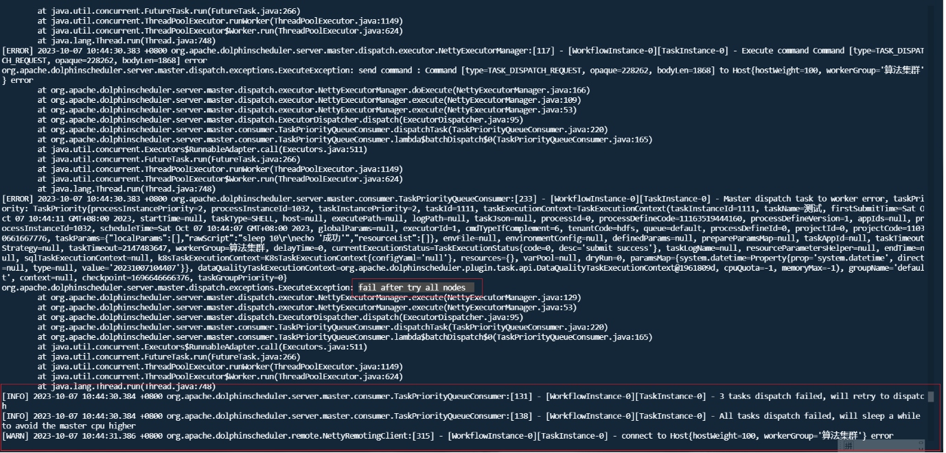 > I have also experienced such problems, which seriously affect the normal operation of scheduled tasks. **version**:3.1.7 > > **Reproduction steps** > > 1. Create Work groups >  > 2. Create Test Tasks(Three different working groups) > Task 1 use '大数据集群' worker group > >  > > Task 2 use '算法集群' worker group > >  > > Task 3 use 'default' worker group > >  > > Set scheduled execution,online workflow and scheduling 3. Stop the worker of the '算法集群'`* * * * * ? *`  > > **After stopping, all tasks will be affected and an error will be reported as task instance is null or host is null.** > > After stopping woker group info:  > > After stopping task execution status:      > > error logs message:  > > After starting the stopped worker, the task resumes execution. A large number of backlogged tasks are resuming execution, which may cause the cluster to be in a high load state and lead to the downtime of other services in the cluster. This is very dangerous I don't quite understand why the node downtime of the '算法集群' worker group affects the tasks of other worker group nodes -- This is an automated message from the Apache Git Service. To respond to the message, please log on to GitHub and use the URL above to go to the specific comment. To unsubscribe, e-mail: [email protected] For queries about this service, please contact Infrastructure at: [email protected]