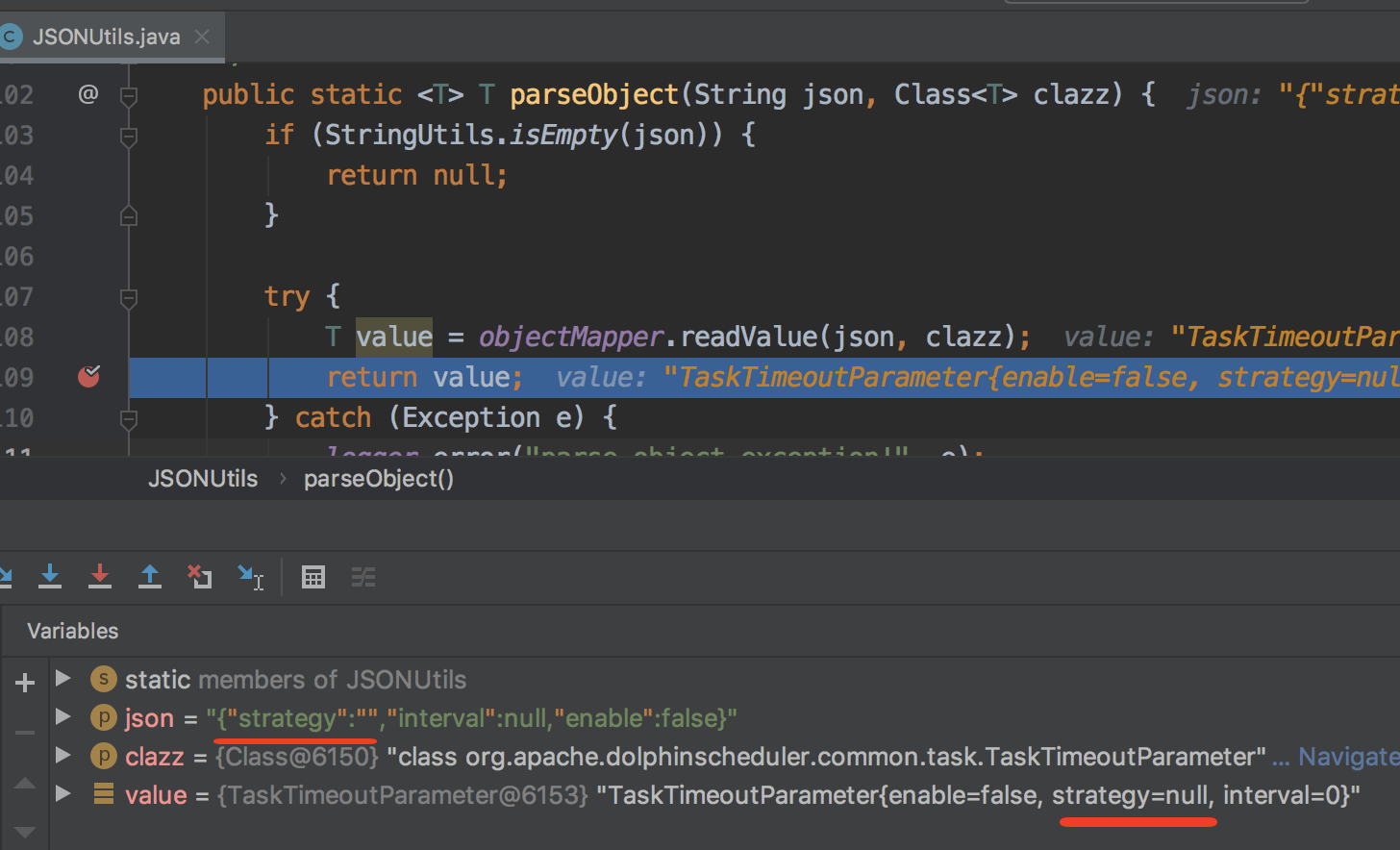 org.apache.dolphinscheduler.common.utils.JSONUtils.parseObject(JSONUtils.java:107)
