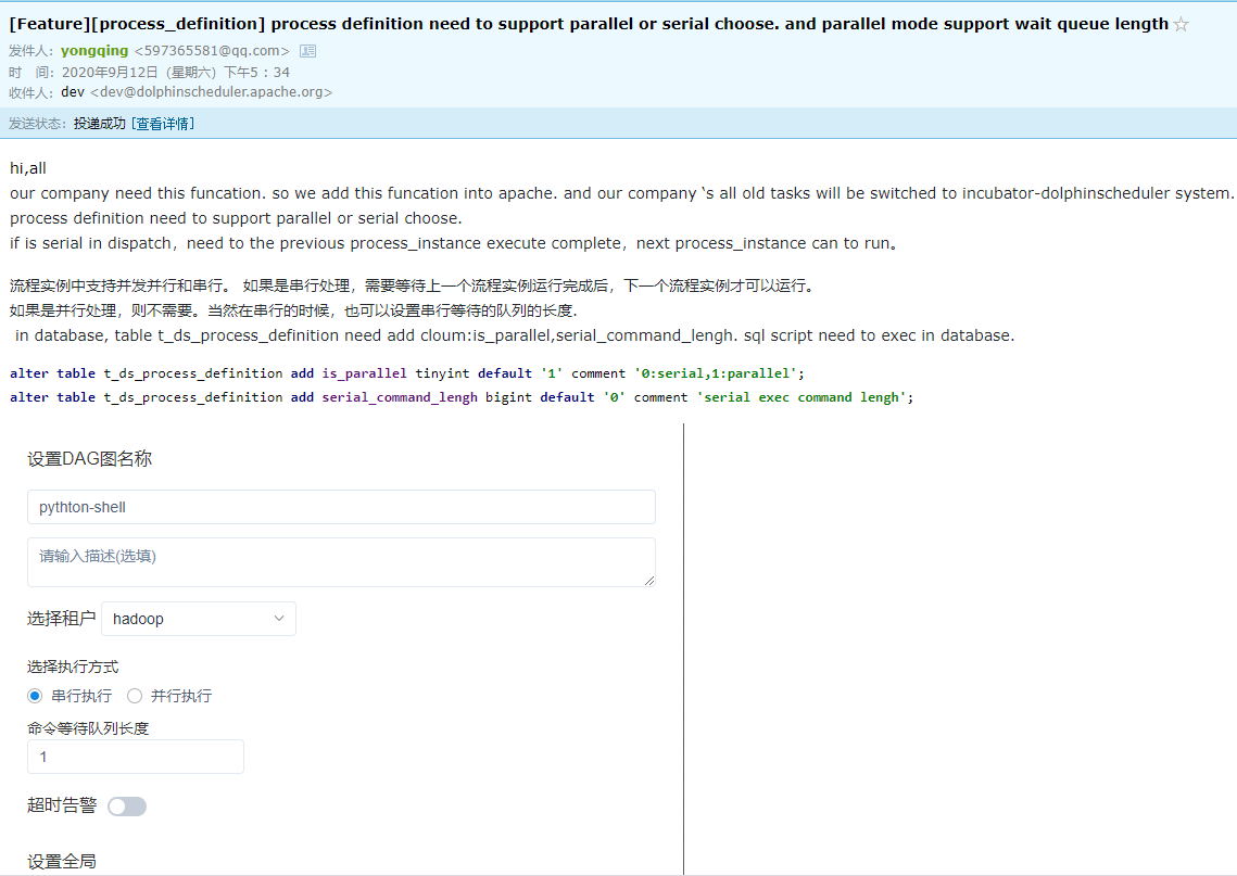 > > @yangyichao-mango @break60 unit test fail because in database, table t_ds_process_definition need add cloum:is_parallel,serial_command_lengh. sql script need to exec in database. > > If this pr need to change the database schema, you need to send a mail to mailing list to discuss this feature before submit a pr. > You can send a mail about why need to add the column and the necessity about adding the new column to `[email protected]`  ---------------------------------------------------------------- This is an automated message from the Apache Git Service. To respond to the message, please log on to GitHub and use the URL above to go to the specific comment. For queries about this service, please contact Infrastructure at: [email protected]