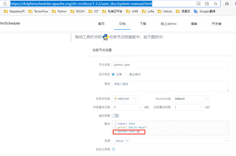 官网上https://dolphinscheduler.apache.org/zh-cn/docs/1.3.2/user_doc/system-manual.html 关于python调用的资料编有问题。 如下:  可以再python脚本里调用 `python test.py`么? 还是说后端做的特殊处理? 我再尝试这样调用时没有成功, 这样很容易引起误导。 ---------------------------------------------------------------- This is an automated message from the Apache Git Service. To respond to the message, please log on to GitHub and use the URL above to go to the specific comment. For queries about this service, please contact Infrastructure at: [email protected]