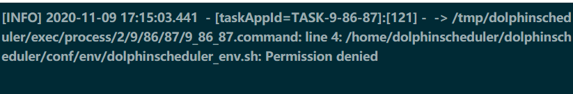 *For better global communication, please give priority to using English description, thx! * *Please review https://dolphinscheduler.apache.org/en-us/docs/development/issue.html when describe an issue.* **Describe the question** When a task is executed, as long as the tenant of the task is not the root tenant, the execution will fail,the logs as fallows: [INFO] 2020-11-09 17:15:03.441 - [taskAppId=TASK-9-86-87]:[121] - -> /tmp/dolphinscheduler/exec/process/2/9/86/87/9_86_87.command: line 4: /home/dolphinscheduler/dolphinscheduler/conf/env/dolphinscheduler_env.sh: Permission denied  **Which version of DolphinScheduler:** -[1.3.2-preview] **Requirement or improvement** - Please describe about your requirements or improvement suggestions. ---------------------------------------------------------------- This is an automated message from the Apache Git Service. To respond to the message, please log on to GitHub and use the URL above to go to the specific comment. For queries about this service, please contact Infrastructure at: [email protected]