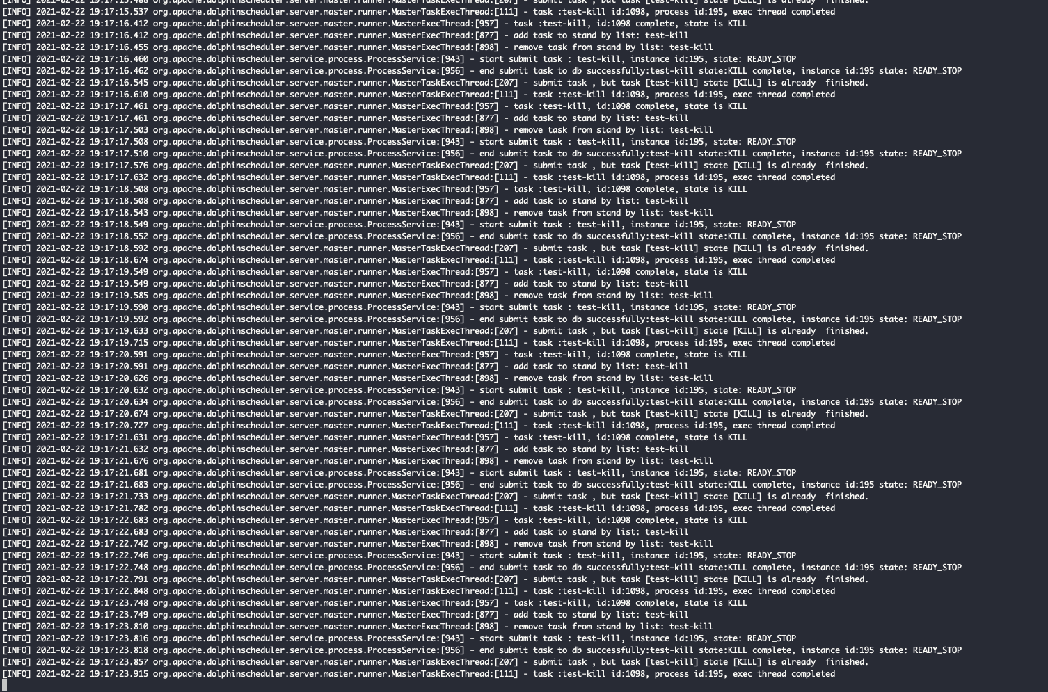 **For better global communication, Please describe it in English. If you feel the description in English is not clear, then you can append description in Chinese(just for Mandarin(CN)), thx! ** **Describe the bug** Process cannot stop when killed with retry. **To Reproduce** Steps to reproduce the behavior, for example: 1. create a process,and a task with retry  2. start the process,then kill it the task will be killed and process in status ready_stop   3. dolphinscheduler-master.log echo log  4. See error **Expected behavior** A clear and concise description of what you expected to happen. **Which version of Dolphin Scheduler:** -[dev] **Additional context** Add any other context about the problem here. **Requirement or improvement** - Please describe about your requirements or improvement suggestions. ---------------------------------------------------------------- This is an automated message from the Apache Git Service. To respond to the message, please log on to GitHub and use the URL above to go to the specific comment. For queries about this service, please contact Infrastructure at: [email protected]