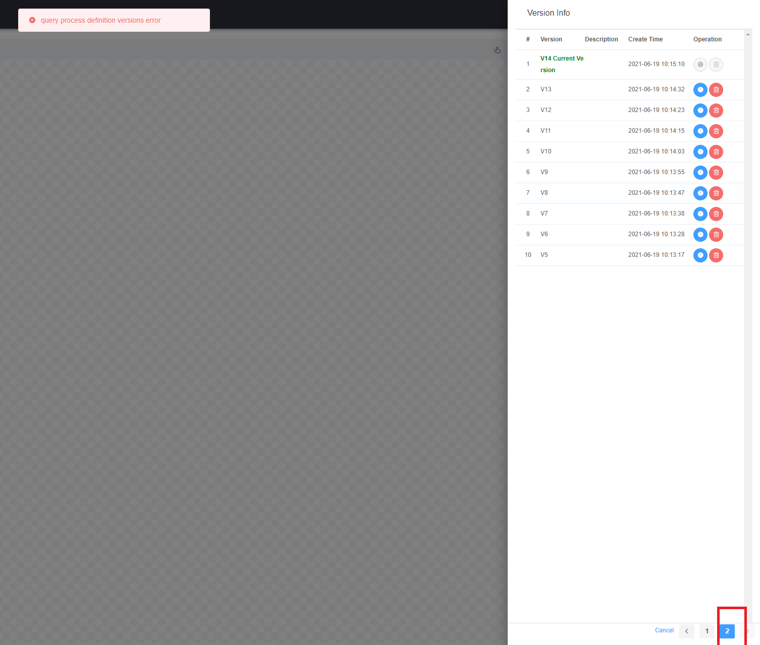 <!--Thanks very much for contributing to Apache DolphinScheduler. Please review https://dolphinscheduler.apache.org/en-us/community/development/pull-request.html before opening a pull request.--> ## Purpose of the pull request bug fix If there are more than 10 versions corresponding to the process definition and more than one page is displayed, an error will be reported when trying to jump to the second page  ## Brief change log Modify the pageSize parameter in the page the first page, requestUrl:`http://localhost:8888/dolphinscheduler/projects/sql/process/versions?pageNo=1&**pageSize=10**&processDefinitionCode=....` the first page, requestUrl:`http://localhost:8888/dolphinscheduler/projects/sql/process/versions?pageNo=2&processDefinitionCode=...` **Starting from the second page, due to the lack of pageSize parameter, the backend will fail to parse the parameters** ## Verify this pull request a small update on front-end. Munual test works well like below:  -- This is an automated message from the Apache Git Service. To respond to the message, please log on to GitHub and use the URL above to go to the specific comment. For queries about this service, please contact Infrastructure at: [email protected]