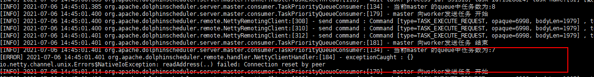 After using Dolphin Scheduler to create a simple work flow that contains some tasks, few tasks can not run in time when the timer tasks trigger. In this case, master node and worker node load avg is very low, it seems like this always happens when the Netty Error occurs. In the work flow, the task instance is Submit Success status, but can not get any Log Info in execute worker node, this situation lasts until task instance time out. Please help to confirm whether this bug is related to Netty Error and fix this BUG Dolphin Scheduler Version is 1.3.6 master(12c 24g) property: master.exec.task.num=50; master.dispatch.task.num = 100; worker(32c 64g) property is default    By Analyzing the worker node log, The worker node normally execute 4-5 tasks at the same schedule time -- This is an automated message from the Apache Git Service. To respond to the message, please log on to GitHub and use the URL above to go to the specific comment. To unsubscribe, e-mail: [email protected] For queries about this service, please contact Infrastructure at: [email protected]