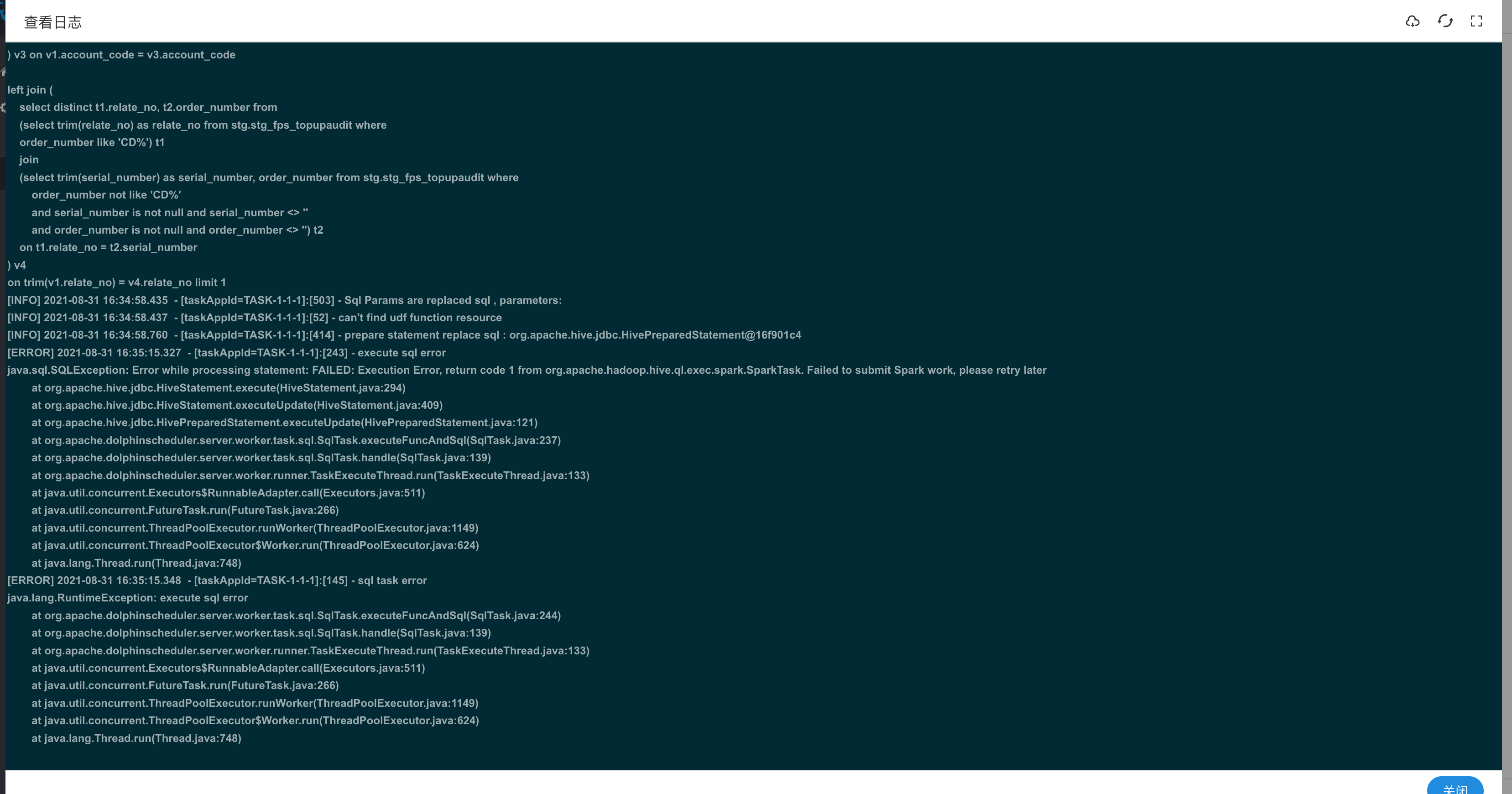 Please help to check the error log, I can execute HQL in other places. But dolphinScheduler reported an error -- This is an automated message from the Apache Git Service. To respond to the message, please log on to GitHub and use the URL above to go to the specific comment. To unsubscribe, e-mail: [email protected] For queries about this service, please contact Infrastructure at: [email protected]