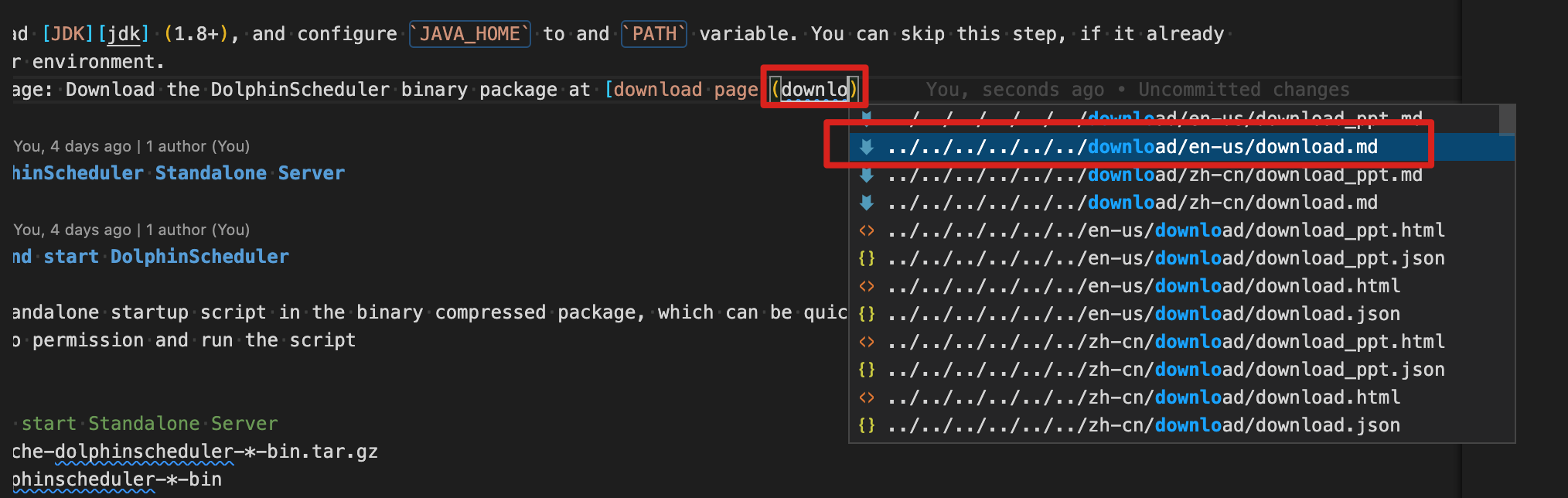 @lukairui find out some of our download link is broken, but have no time, so I submit this patch to fix it. This issue due to we do not use markdown file relative location to generation url link. The download page relative location is `../../../../../../download/en-us/download.md` but become `../../../../../../en-us/download/download.md` after we render it. I think there is todo task for us, we should make our doc easy to maintain by using path same as relative location. It more easy to write with auto-complete plugin. All I have to do is type `download` and select the relative location as screenshot  -- This is an automated message from the Apache Git Service. To respond to the message, please log on to GitHub and use the URL above to go to the specific comment. To unsubscribe, e-mail: [email protected] For queries about this service, please contact Infrastructure at: [email protected]