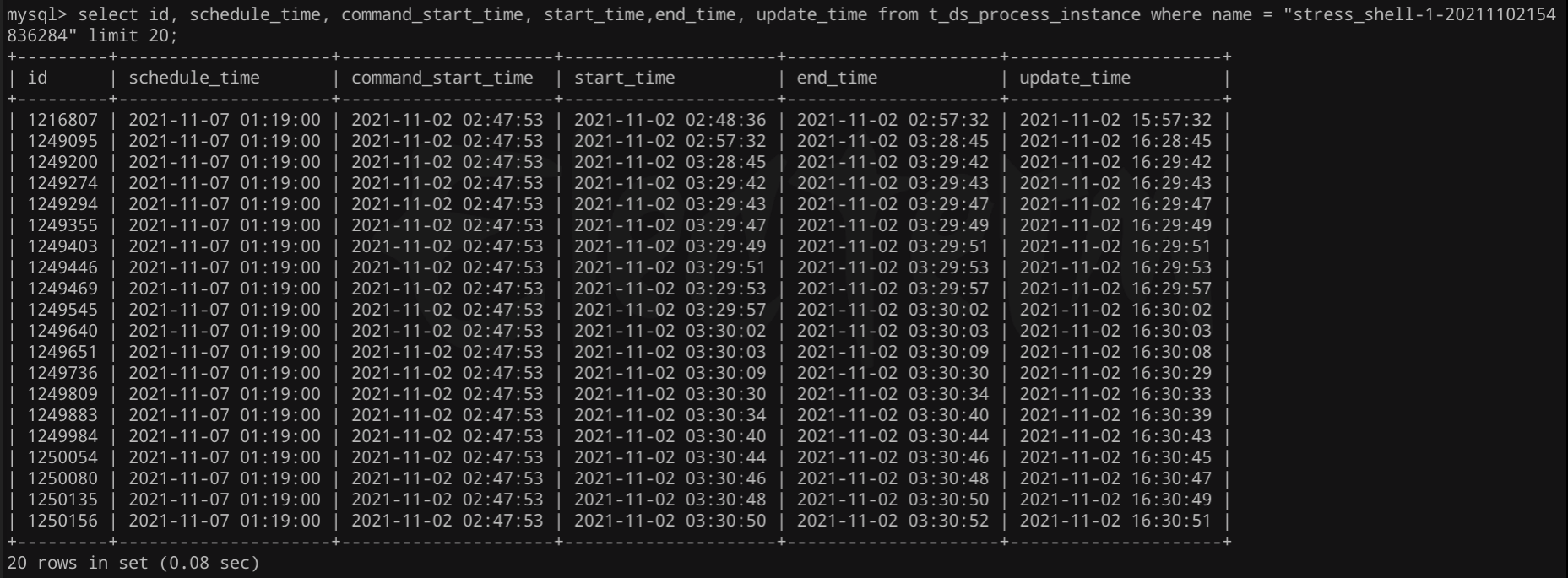 ### Search before asking - [X] I had searched in the [issues](https://github.com/apache/dolphinscheduler/issues?q=is%3Aissue) and found no similar issues. ### What happened version: 2.0-alpha When I run with complete data model, I found some process is always running, with same name、schedule time、command_start_time, but different id、start_time、end_time.     ### What you expected to happen Complete data normally. ### How to reproduce It seems occasional. ### Anything else _No response_ ### Are you willing to submit PR? - [ ] Yes I am willing to submit a PR! ### Code of Conduct - [X] I agree to follow this project's [Code of Conduct](https://www.apache.org/foundation/policies/conduct) -- This is an automated message from the Apache Git Service. To respond to the message, please log on to GitHub and use the URL above to go to the specific comment. To unsubscribe, e-mail: [email protected] For queries about this service, please contact Infrastructure at: [email protected]