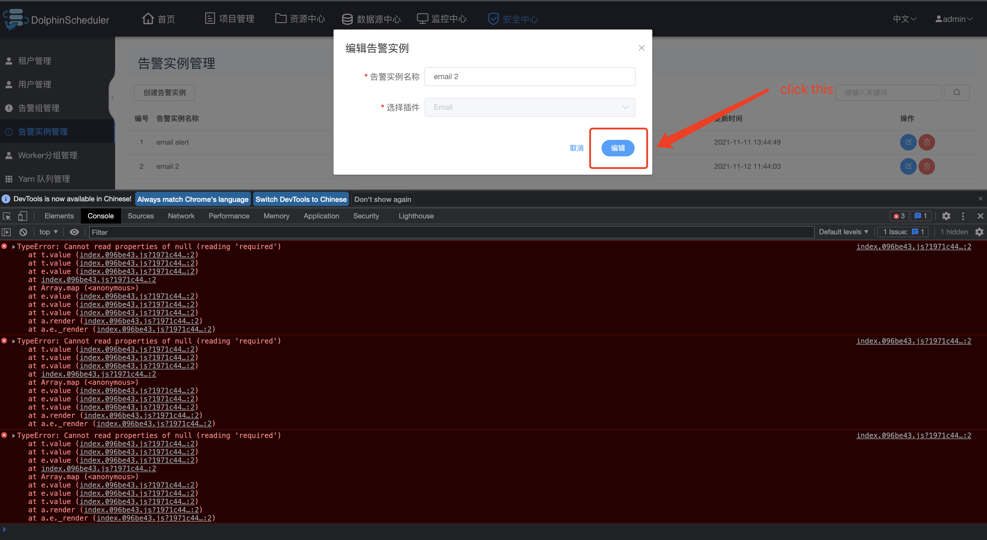 ### Search before asking - [X] I had searched in the [issues](https://github.com/apache/dolphinscheduler/issues?q=is%3Aissue) and found no similar issues. ### What happened Error happened when edit an exist email alter instance. DolphinScheduler version: 2.0.0-release-prepare Browser: Google Chrome 95.0.4638.69 (x86_64) ### What you expected to happen Modify success. ### How to reproduce  ### Anything else _No response_ ### Are you willing to submit PR? - [ ] Yes I am willing to submit a PR! ### Code of Conduct - [X] I agree to follow this project's [Code of Conduct](https://www.apache.org/foundation/policies/conduct) -- This is an automated message from the Apache Git Service. To respond to the message, please log on to GitHub and use the URL above to go to the specific comment. To unsubscribe, e-mail: [email protected] For queries about this service, please contact Infrastructure at: [email protected]