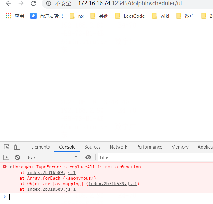 ### Search before asking - [X] I had searched in the [issues](https://github.com/apache/dolphinscheduler/issues?q=is%3Aissue) and found no similar issues. ### What happened DolphinScheduler deployment document: "index.2b31b589.js:1 Uncaught TypeError: S. replaceAll is not a function" error, page blank   ### What you expected to happen Deployment Normal Access ### How to reproduce https://dolphinscheduler.apache.org/zh-cn/docs/latest/user_doc/guide/installation/pseudo-cluster.html ### Anything else _No response_ ### Version 3.0.0-beta-1 ### Are you willing to submit PR? - [ ] Yes I am willing to submit a PR! ### Code of Conduct - [X] I agree to follow this project's [Code of Conduct](https://www.apache.org/foundation/policies/conduct) -- This is an automated message from the Apache Git Service. To respond to the message, please log on to GitHub and use the URL above to go to the specific comment. To unsubscribe, e-mail: [email protected] For queries about this service, please contact Infrastructure at: [email protected]