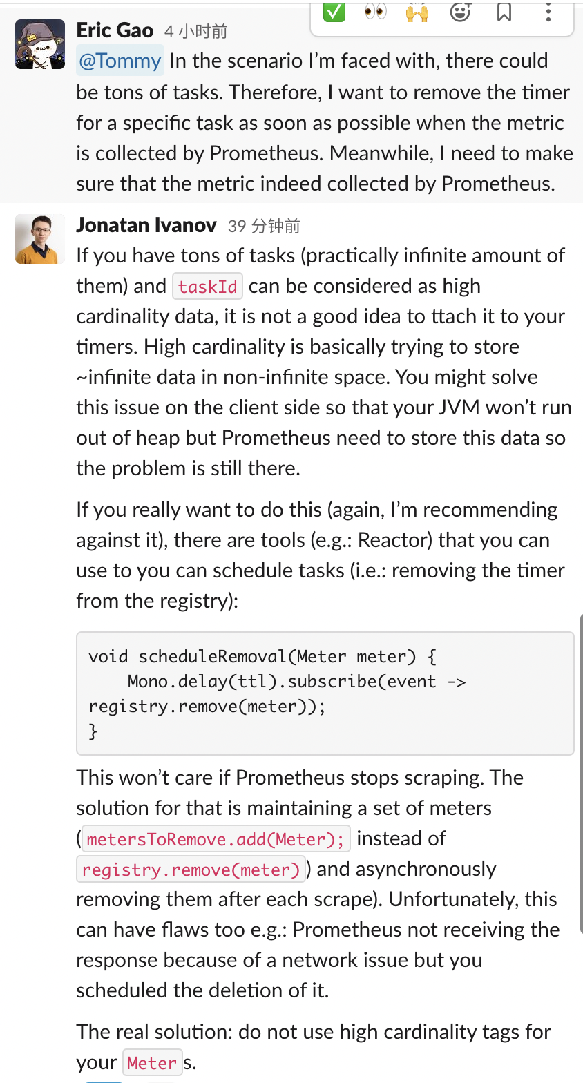 I just got a reply from the author of `Micrometer`. Enabling users to choose several VIP workflows to add extra detailed metrics would definitely be much better than simply generating detailed metrics for all workflows / tasks. -- This is an automated message from the Apache Git Service. To respond to the message, please log on to GitHub and use the URL above to go to the specific comment. To unsubscribe, e-mail: [email protected] For queries about this service, please contact Infrastructure at: [email protected]