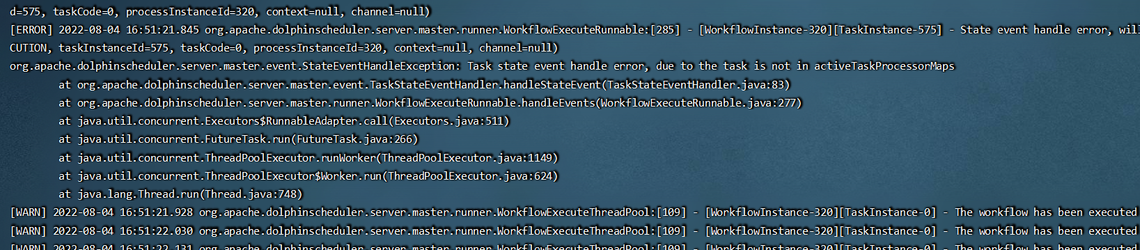 **Description Error logs in the master server**  **Sometimes the subprocess stays in execution and sometimes it stays in a successful commit state**  **However, the tasks of each subprocess have already been executed**  **The data host column in the task instance is empty while the subprocess remains in the committed success state**  **The operating environment is a multi-Master node** -- This is an automated message from the Apache Git Service. To respond to the message, please log on to GitHub and use the URL above to go to the specific comment. To unsubscribe, e-mail: [email protected] For queries about this service, please contact Infrastructure at: [email protected]