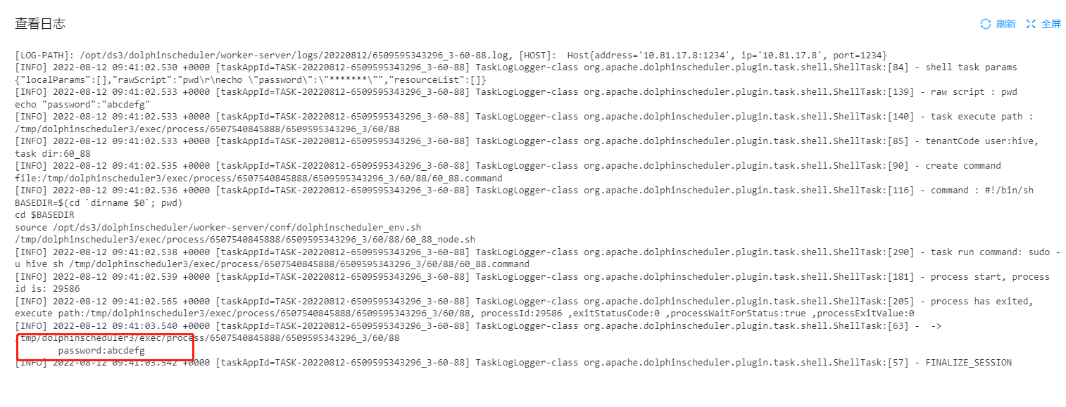 version:3.0.0 shell task echo "password":"abcdefg"  -- This is an automated message from the Apache Git Service. To respond to the message, please log on to GitHub and use the URL above to go to the specific comment. To unsubscribe, e-mail: [email protected] For queries about this service, please contact Infrastructure at: [email protected]