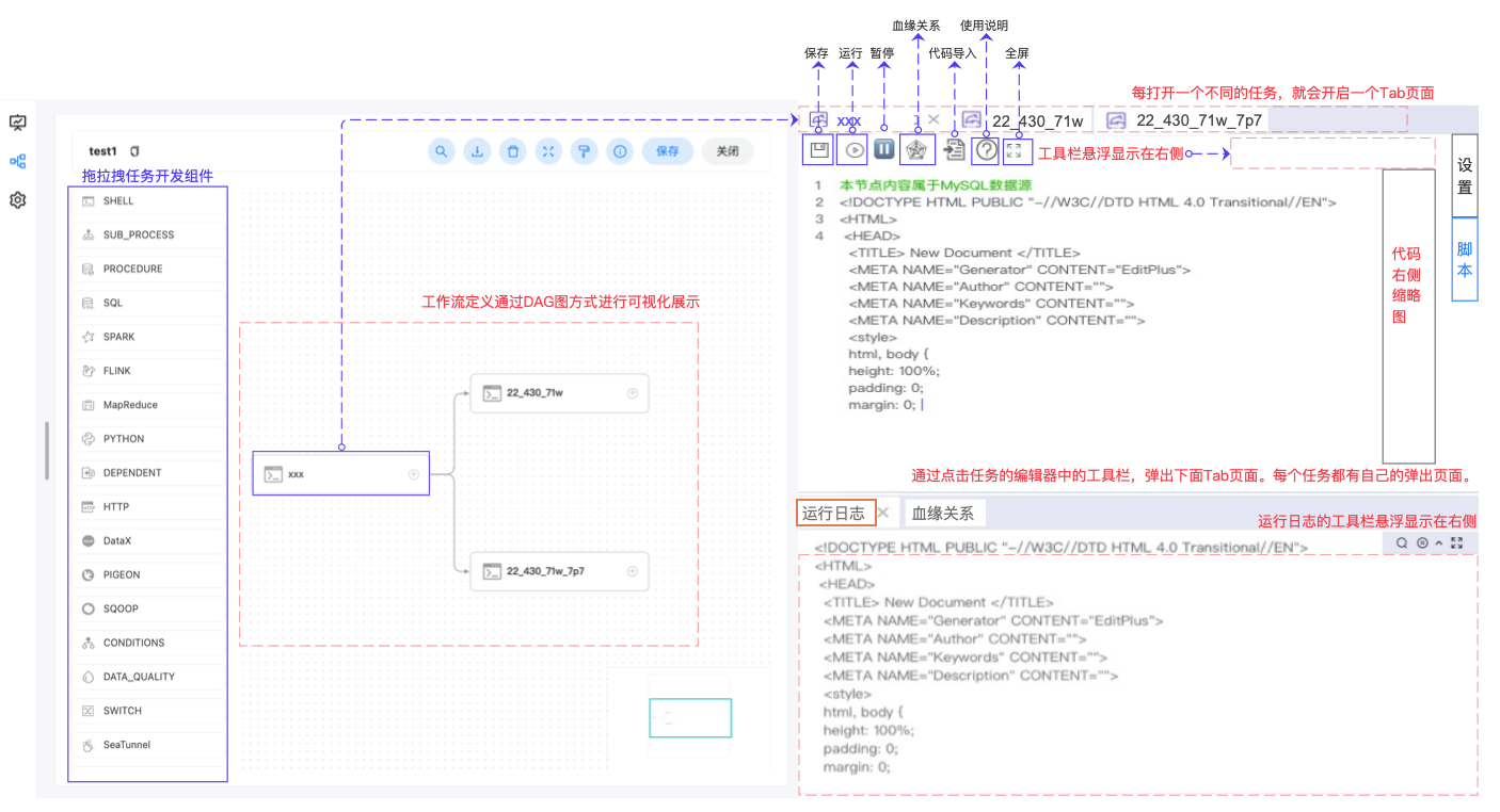### Search before asking - [X] I had searched in the [issues](https://github.com/apache/dolphinscheduler/issues?q=is%3Aissue) and found no similar feature requirement. ### Description Now DS has a code interface like this, I think it is not very comfortable for developers to write sql or python in text box.  Here is the solution of some other projects:  Here is our proposed solutions: 1. on the left we still have DAG map 2. when you click sql task, or shell task, pop up a combo box on the right. it has 2 box. one is parameter setting(such as resource, database source). the other is a IDE written box. 3. IDE can support SQL/python grammar check so far. 4. IDE try support SQL/python run and see try-run log The design is as below. What do you think about it?  ### Use case _No response_ ### Related issues _No response_ ### Are you willing to submit a PR? - [ ] Yes I am willing to submit a PR! ### Code of Conduct - [X] I agree to follow this project's [Code of Conduct](https://www.apache.org/foundation/policies/conduct) -- This is an automated message from the Apache Git Service. To respond to the message, please log on to GitHub and use the URL above to go to the specific comment. To unsubscribe, e-mail: [email protected] For queries about this service, please contact Infrastructure at: [email protected]