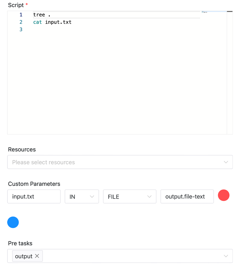 <!--Thanks very much for contributing to Apache DolphinScheduler. Please review https://dolphinscheduler.apache.org/en-us/community/development/pull-request.html before opening a pull request.--> ## Purpose of the pull request ### FILE Parameter Use the file parameter to pass files (or folders, hereinafter referred to as **files**) in the working directory of the upstream task to the downstream task in the same workflow instance. The following scenarios may be used - In the ETL task, pass the data files processed by multiple upstream tasks to a specific downstream task. - In the machine learning scenario, pass the data set file of the upstream data preparation task to the downstream model training task. #### Usage ##### Configure file parameter File parameter configuration method: click the plus sign on the right side of "Custom Parameters" on the task definition page to configure. ### Output file to downstream task **Four options of custom parameters are:** - Parameter name: the identifier used when passing tasks, such as `KEY1` and `KEY2` in the figure below - Direction: OUT, which means outputting the file to the downstream task - Parameter type: FILE, indicating file parameter - Parameter value: output file path, such as `data` and `data/test2/text.txt` in the figure below The configuration in the figure below indicates that the `output` task passes two file data to the downstream task, respectively: - Pass out the folder `data`, and mark it as `dir-data`. The downstream task can get this folder through `output.dir-data` - Pass out the file `data/test2/text.txt`, and mark it as `file-text`. The downstream task can get this folder through `output.file-text`  ##### Get the file from the upstream task **Four options of custom parameters are:** - Parameter name: the position where the upstream file is saved after input, such as `input_dir` used in the figure below - Direction: IN, which means to get the file from the upstream task - Parameter type: FILE, indicating file parameter - Parameter value: the identifier of the upstream file, in the format of `taskName.KEY`. For example, `output.dir-data` in the figure below, where `output` is the name of the upstream task, and `dir-data` is the file identifier output by the upstream task The configuration in the figure below indicates that the task gets the folder identified by `dir-data` from the upstream task `output` and saves it as `input_dir`  The configuration in the figure below indicates that the task gets the file identified by `file-text` from the upstream task `output` and saves it as `input.txt`  close: #12479 ## Brief change log <!--*(for example:)* - *Add maven-checkstyle-plugin to root pom.xml* --> ## Verify this pull request <!--*(Please pick either of the following options)*--> This pull request is code cleanup without any test coverage. *(or)* This pull request is already covered by existing tests, such as *(please describe tests)*. (or) This change added tests and can be verified as follows: <!--*(example:)* - *Added dolphinscheduler-dao tests for end-to-end.* - *Added CronUtilsTest to verify the change.* - *Manually verified the change by testing locally.* --> (or) If your pull request contain incompatible change, you should also add it to `docs/docs/en/guide/upgrede/incompatible.md` -- This is an automated message from the Apache Git Service. To respond to the message, please log on to GitHub and use the URL above to go to the specific comment. To unsubscribe, e-mail: [email protected] For queries about this service, please contact Infrastructure at: [email protected]