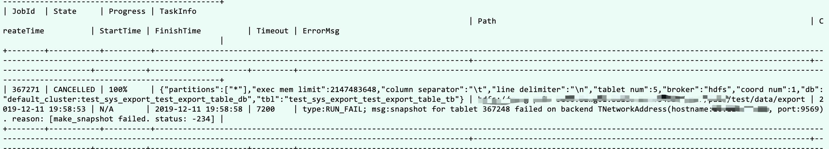 zhangy5 opened a new issue #2432: Export job cancelled with ErrorMsg 'make_snapshot failed. status: -234' URL: https://github.com/apache/incubator-doris/issues/2432 **Describe the bug** export job failed.  **To Reproduce** CREATE DATABASE test_sys_export_test_export_table_db CREATE TABLE test_sys_export_test_export_table_db.test_sys_export_test_export_table_tb ( k1 tinyint NULL, k2 smallint NULL, k3 int NULL, k4 bigint NULL, k5 decimal(9, 3) NULL, k6 char(5) NULL, k10 date NULL, k11 datetime NULL, k7 varchar(20) NULL, k8 double max NULL, k9 float sum NULL ) DISTRIBUTED BY HASH(k1) BUCKETS 5 LOAD LABEL test_sys_export_test_export_table_db.label_11_19_58_27_648482_1265004945 (DATA INFILE("hdfs://ip:port/user/palo/test/data/qe/baseall.txt") INTO TABLE `test_sys_export_test_export_table_tb`) WITH BROKER "hdfs" ("username"="root", "password"="") EXPORT TABLE test_sys_export_test_export_table_db.test_sys_export_test_export_table_tb TO "hdfs://ip:port/user/palo/test/data/export" WITH BROKER "hdfs" ("username"="root", "password"="") **Expected behavior** Expected export finished. commit version: 036d7da290a66089b40bc962d9b7326a6867aab5