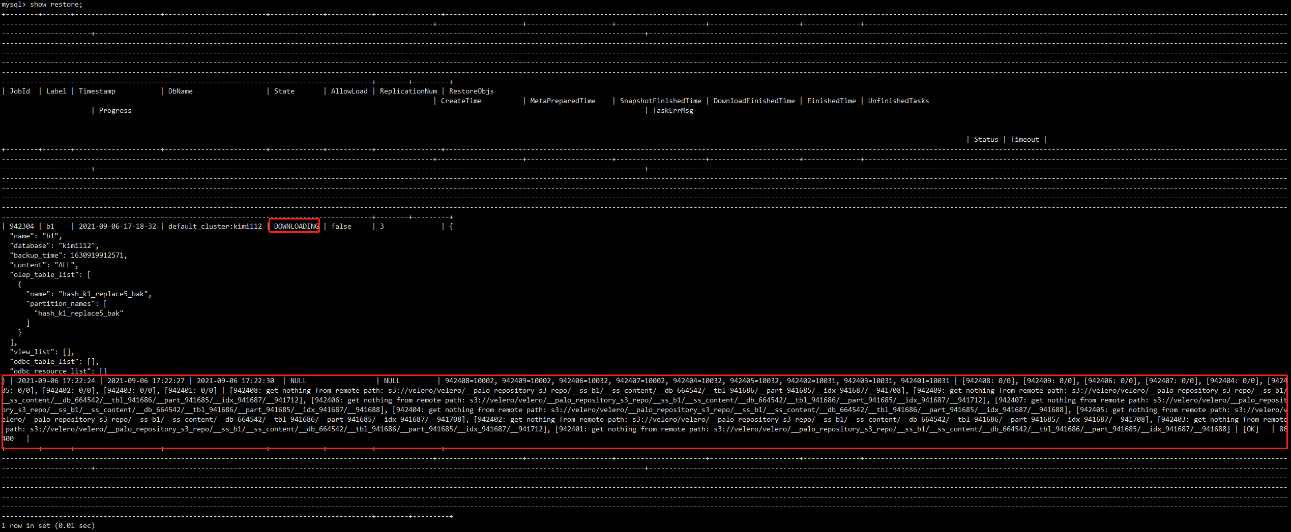 ### Search before asking - [X] I had searched in the [issues](https://github.com/apache/incubator-doris/issues?q=is%3Aissue) and found no similar issues. ### Version 0.14.0-release-4c1e52261 ### What's Wrong? 使用minio作为s3的存储源,按照官方的备份恢复步骤进行操作。 第一步,创建s3的仓库,仓库名为s3_repo,创建成功。 第二步,创建备份,通过命令BACKUP SNAPSHOT kimi112.b1 TO s3_repo on (hash_k1_replace5_bak);创建备份成成功。 这里有个问题就是生成了2个__palo_repository_s3_repo文件件并在不同的目录中,这里有点怪。  第三步,查看备份信息,show snapshot on s3_repo可查看到  第四步,恢复快照,通过命令restore SNAPSHOT kimi112.b1 from s3_repo on (`hash_k1_replace5_bak`) PROPERTIES ("backup_timestamp"="2021-09-06-17-18-32" );执行命令成功。 第五步,查看恢复状态,进入到目标库,show restore;  这里downloading卡住,这里应该算是报错:get nothing from remote path: s3://velero/velero/__palo_repository_s3_repo/__ss_b1/__ss_content/__db_664542/__tbl_941686/__part_941685/__idx_941687/__941688 无法表恢复。 这里应该是备份路径不统一,应该是个bug。 在进行恢复的时候,不能获取到远程路径的数据,也应该是个bug。 ### What You Expected? 按照help cmd中的操作帮助,我不认为我操作有问题,那怎么解决这个备份还原问题,希望能得到帮助。谢谢 ### How to Reproduce? _No response_ ### Anything Else? _No response_ ### Are you willing to submit PR? - [ ] Yes I am willing to submit a PR! ### Code of Conduct - [X] I agree to follow this project's [Code of Conduct](https://www.apache.org/foundation/policies/conduct) -- This is an automated message from the Apache Git Service. To respond to the message, please log on to GitHub and use the URL above to go to the specific comment. To unsubscribe, e-mail: [email protected] For queries about this service, please contact Infrastructure at: [email protected] --------------------------------------------------------------------- To unsubscribe, e-mail: [email protected] For additional commands, e-mail: [email protected]