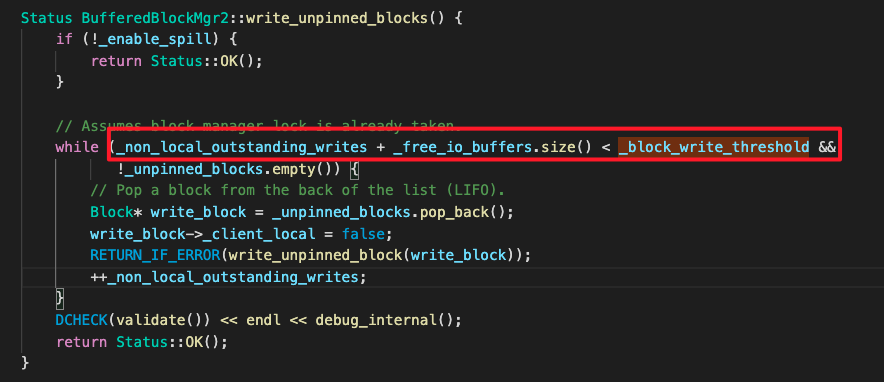 > The purpose of the first 1/2 is to reserve half of exec_mem_limit for other components rather than block_mgr. The purpose of the second 1/2 is to trigger spill before block_mgr_limit is full. Maybe twice 1/2 seems to be conservative. The first 1/2 I understand, @xiaokang great~, but I'm not sure if 1/2 is a good value. The role of the second 1/2. Currently, `BufferedBlockMgr2` has a similar implementation. In `write_unpinned_blocks`, unpinned blocks will be spilled in advance to avoid waiting when full.  -- This is an automated message from the Apache Git Service. To respond to the message, please log on to GitHub and use the URL above to go to the specific comment. To unsubscribe, e-mail: [email protected] For queries about this service, please contact Infrastructure at: [email protected] --------------------------------------------------------------------- To unsubscribe, e-mail: [email protected] For additional commands, e-mail: [email protected]