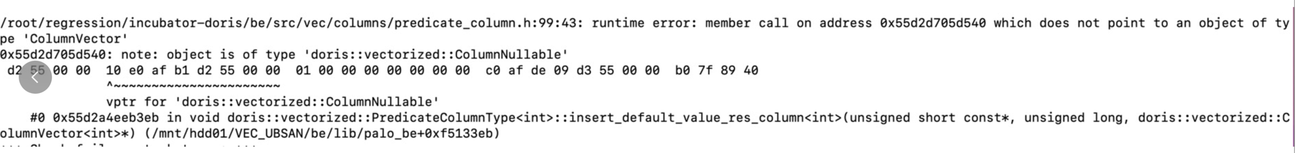 ### Search before asking - [X] I had searched in the [issues](https://github.com/apache/incubator-doris/issues?q=is%3Aissue) and found no similar issues. ### Version dev-1.0.1 ### What's Wrong? UBSAN report like below.  ![Uploading image.png…]() ### What You Expected? DOT CORE DUMP ### How to Reproduce? select n_name, r_name from region right outer join nation on n_nationkey = r_regionkey on tpch data. ### Anything Else? _No response_ ### Are you willing to submit PR? - [ ] Yes I am willing to submit a PR! ### Code of Conduct - [X] I agree to follow this project's [Code of Conduct](https://www.apache.org/foundation/policies/conduct) -- This is an automated message from the Apache Git Service. To respond to the message, please log on to GitHub and use the URL above to go to the specific comment. To unsubscribe, e-mail: [email protected] For queries about this service, please contact Infrastructure at: [email protected] --------------------------------------------------------------------- To unsubscribe, e-mail: [email protected] For additional commands, e-mail: [email protected]