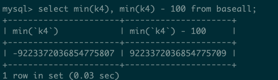 ### Search before asking - [X] I had searched in the [issues](https://github.com/apache/doris/issues?q=is%3Aissue) and found no similar issues. ### Version master: doris-0.0.0-trunk-cf18de1 ### What's Wrong? jenkins failed case: https://ci-builds.apache.org/job/Doris/job/doris_daily_enable_vectorized/201/testReport/(root)/test_query_subselect_1/test_subquery_compute/ k4 is bigint  ### What You Expected? result should be ok ### How to Reproduce? select min(k4), min(k4) - 100.123 from baseall; ### Anything Else? _No response_ ### Are you willing to submit PR? - [ ] Yes I am willing to submit a PR! ### Code of Conduct - [X] I agree to follow this project's [Code of Conduct](https://www.apache.org/foundation/policies/conduct) -- This is an automated message from the Apache Git Service. To respond to the message, please log on to GitHub and use the URL above to go to the specific comment. To unsubscribe, e-mail: [email protected] For queries about this service, please contact Infrastructure at: [email protected] --------------------------------------------------------------------- To unsubscribe, e-mail: [email protected] For additional commands, e-mail: [email protected]