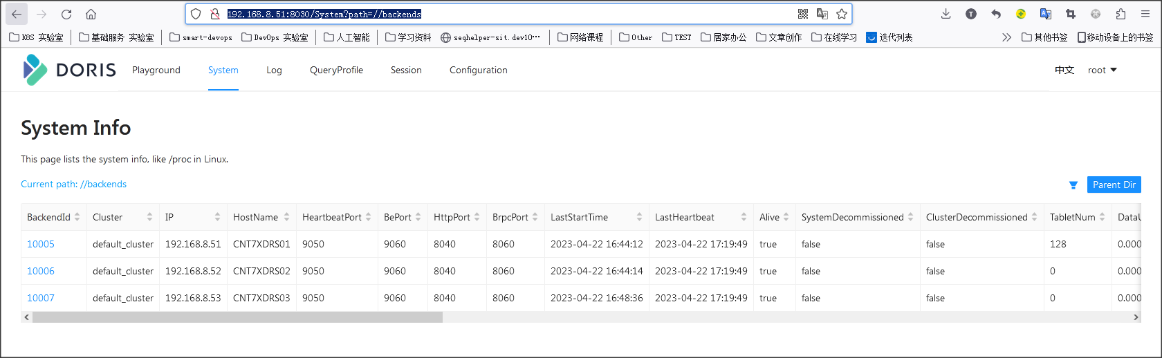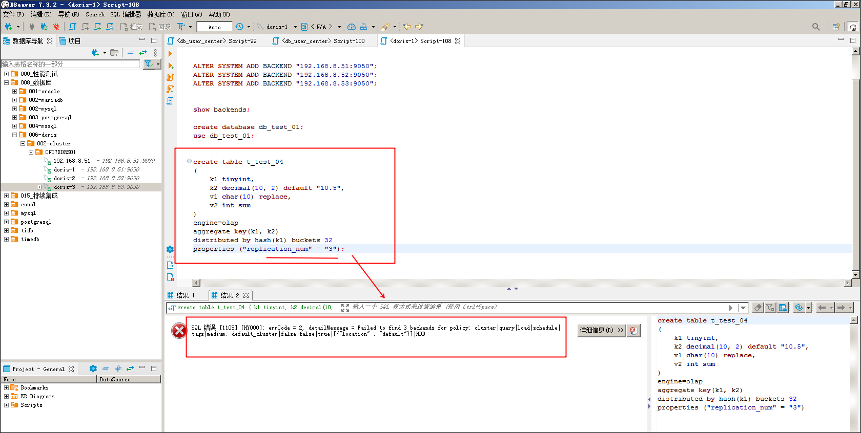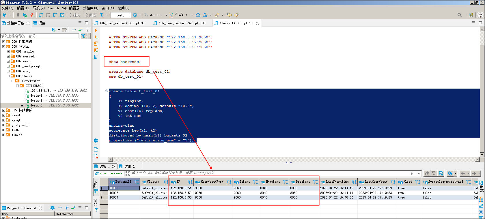 ### Search before asking - [X] I had searched in the [issues](https://github.com/apache/doris/issues?q=is%3Aissue) and found no similar issues. ### Version doris-be: 1.2.2 doris-fe : 1.2.2 os: centos-7.9 x64 ### What's Wrong? 当我建立好一个doris-fe + 3个doris-be节点集群后, 通过网页doris-fe-web(http://HOST_URL:8030/System?path=//backends),可以查看到有成功配置doris-be三个节点。 但是,我在客户端,成功连接:doris-fe服务之后,无法创建多副本的table,报错信息如下图3: 请问,这里SQL执行建表脚本,为何识别不到3个doris-be,但是我网页或命令查询,却有3个doris-be?    ### What You Expected? 这里SQL执行建表脚本,可以识别到有3个doris-be,并且成功创建table成功不报错。 use db_test_01; create table t_test_04 ( k1 tinyint, k2 decimal(10, 2) default "10.5", v1 char(10) replace, v2 int sum ) engine=olap aggregate key(k1, k2) distributed by hash(k1) buckets 32 properties ("replication_num" = "3"); ### How to Reproduce? 执行如下:脚本SQL step 1: -- 配置三个doris-be节点到一个doris-fe节点(mysql 5.7客户端) ALTER SYSTEM ADD BACKEND "192.168.8.51:9050"; ALTER SYSTEM ADD BACKEND "192.168.8.52:9050"; ALTER SYSTEM ADD BACKEND "192.168.8.53:9050"; step 2: -- 执行建表脚本 create database db_test_01; use db_test_01; create table t_test_04 ( k1 tinyint, k2 decimal(10, 2) default "10.5", v1 char(10) replace, v2 int sum ) engine=olap aggregate key(k1, k2) distributed by hash(k1) buckets 32 properties ("replication_num" = "3"); ### Anything Else? N/A ### Are you willing to submit PR? - [X] Yes I am willing to submit a PR! ### Code of Conduct - [X] I agree to follow this project's [Code of Conduct](https://www.apache.org/foundation/policies/conduct) -- This is an automated message from the Apache Git Service. To respond to the message, please log on to GitHub and use the URL above to go to the specific comment. To unsubscribe, e-mail: [email protected] For queries about this service, please contact Infrastructure at: [email protected] --------------------------------------------------------------------- To unsubscribe, e-mail: [email protected] For additional commands, e-mail: [email protected]