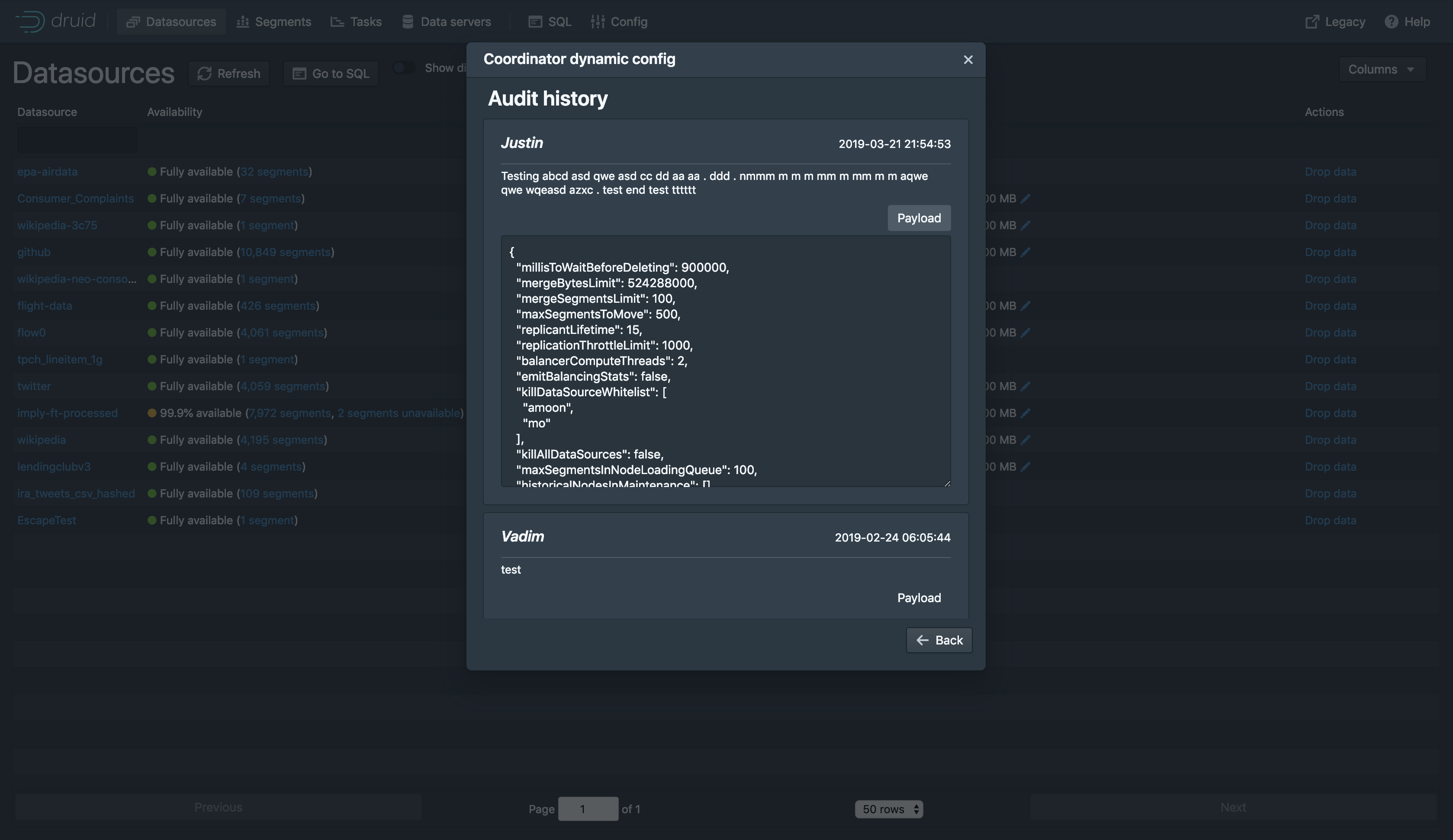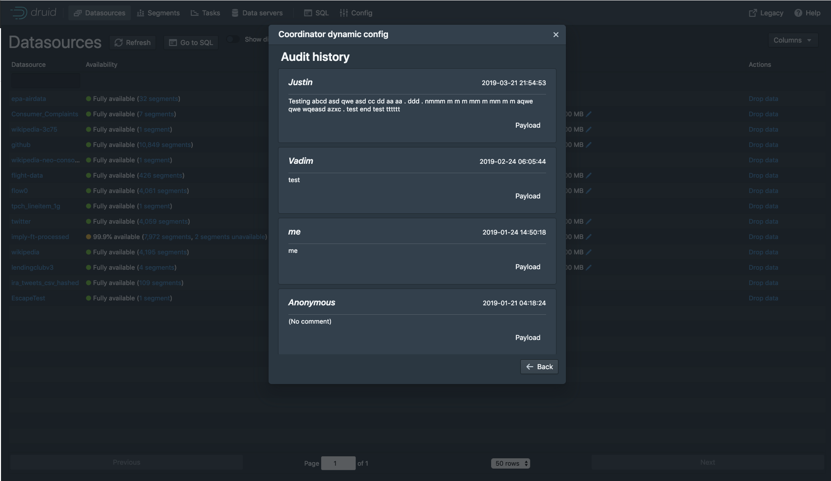 shuqi7 opened a new pull request #7321: Add history dialog in snitch dialog to allow viewing the editing history URL: https://github.com/apache/incubator-druid/pull/7321 - Add a history dialog which can be accessed from retention, coordinator and overlord dialogs. - It would list the latest 100 editing history, including the user name, editing time, comment and the payload. - The payload is displayed in a collapsable text area and could be controlled by the user - Change made by user who declined to input a name and comment will be displayed as "Anonymous" and "(No comment)" Located at the bottom left corner of retention, coordinator and overlord editing dialogs:  History dialog:  Viewing payload: