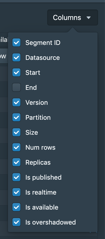 vogievetsky commented on issue #7909: Web-console: Add actions column to segments view URL: https://github.com/apache/incubator-druid/pull/7909#issuecomment-503618217 Actions should appear here:  The 'action' on segment is `Drop segment (disable)` not drop data source