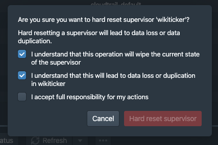 vogievetsky opened a new pull request #9253: Web console: make supervisor reset really scary in the UI URL: https://github.com/apache/druid/pull/9253 Do a better job of conveying just how drastic a supervisor reset is to the user. This PR does two things: - Renames "Reset" to "Hard reset" to make it sound scarier and look less like "Restart" - Makes the user tick a few boxes to ensure they know what they are getting themselves into
