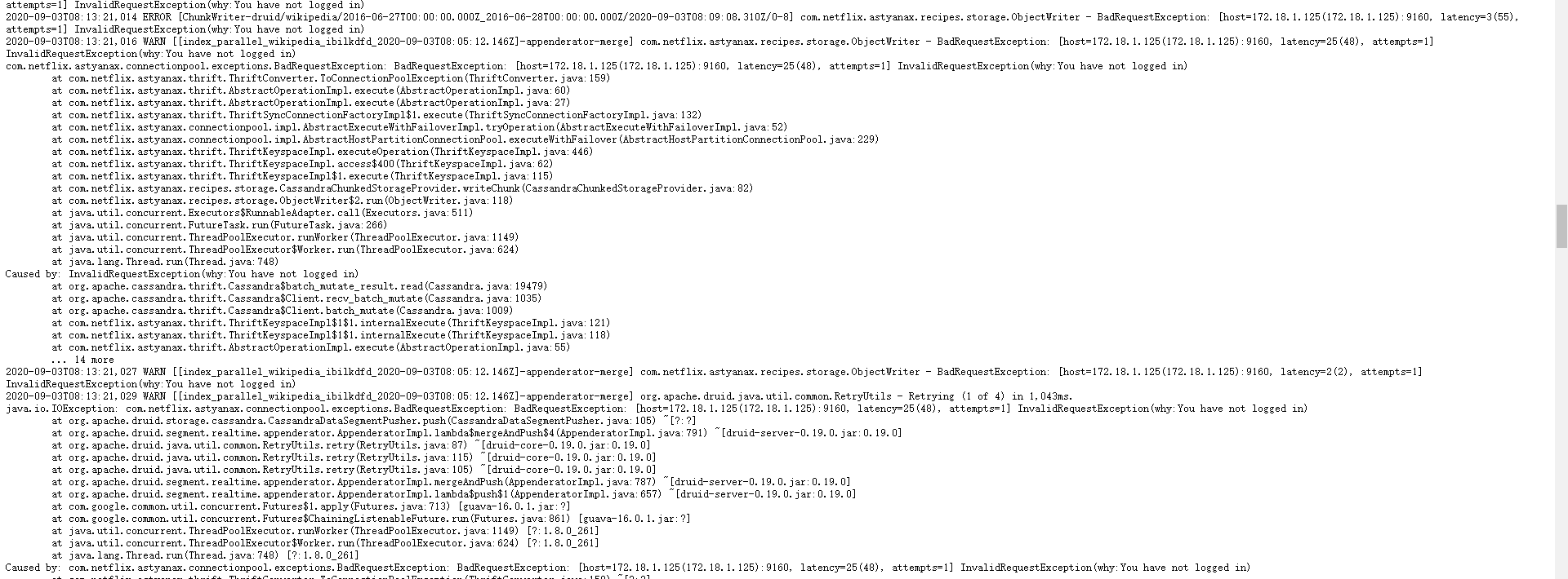 ### Affected Version 0.19 ### Description when set Cassandra :authenticator=PasswordAuthenticator  common set:  - Steps to reproduce the problem - The error message or stack traces encountered. Providing more context, such as nearby log messages or even entire logs, can  I don't know how to set its username and password ---------------------------------------------------------------- This is an automated message from the Apache Git Service. To respond to the message, please log on to GitHub and use the URL above to go to the specific comment. For queries about this service, please contact Infrastructure at: [email protected] --------------------------------------------------------------------- To unsubscribe, e-mail: [email protected] For additional commands, e-mail: [email protected]
