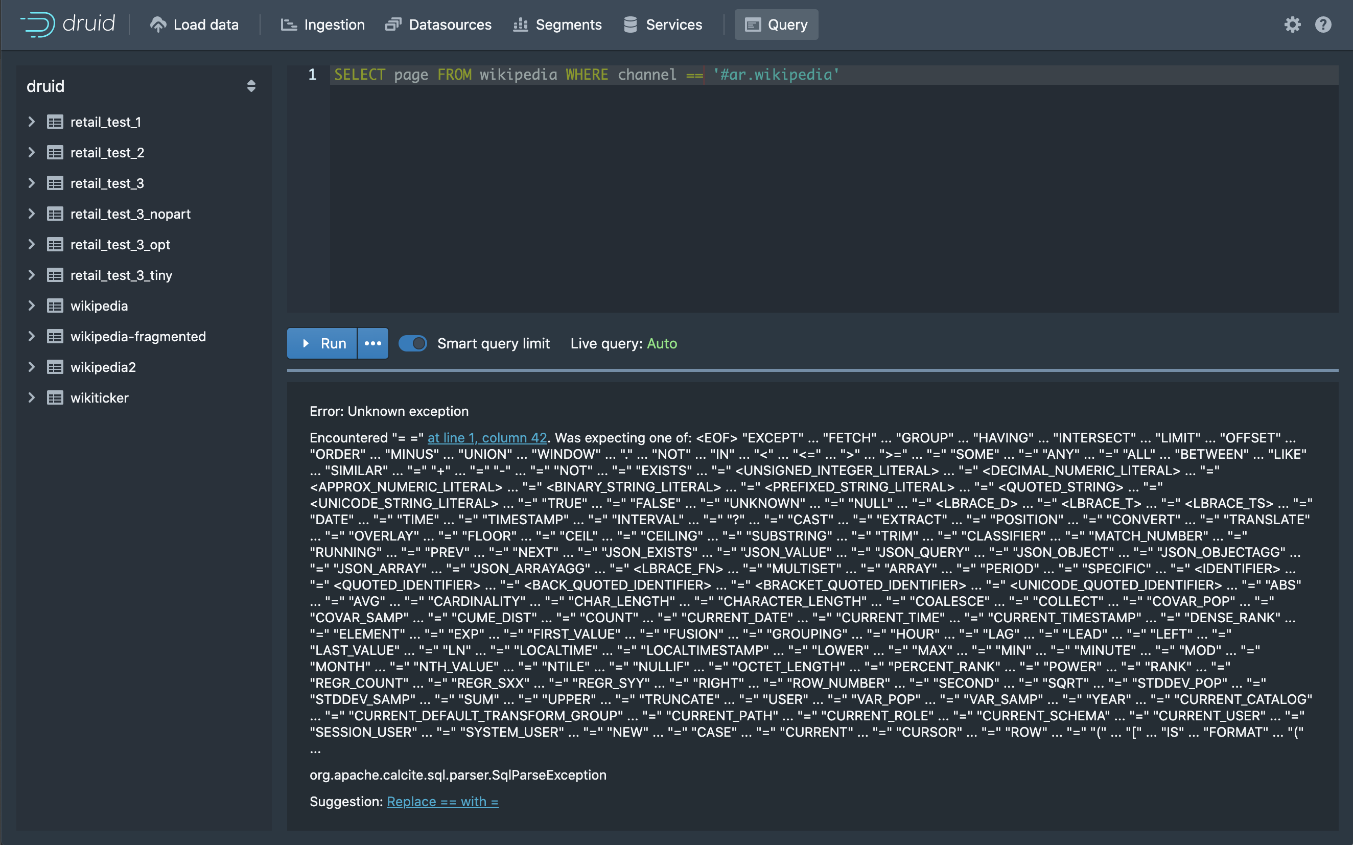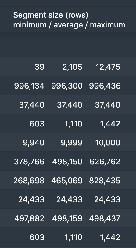 This PR addresses the feedback from the recent work on the new segment distribution in the console. Segment sizes should be in rows not megabytes to fit with the new Druid documentation https://github.com/apache/druid/blob/master/docs/operations/segment-optimization.md Old:  New:  This PR also cleans up some types and adds a nice little error action hint for 3 of the most common SQL query errors (see bottom of screenshot):  ---------------------------------------------------------------- This is an automated message from the Apache Git Service. To respond to the message, please log on to GitHub and use the URL above to go to the specific comment. For queries about this service, please contact Infrastructure at: [email protected] --------------------------------------------------------------------- To unsubscribe, e-mail: [email protected] For additional commands, e-mail: [email protected]