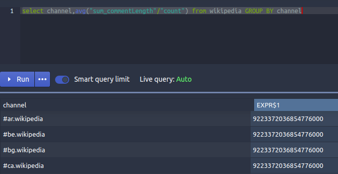 `select channel,avg("sum_commentLength"/"count") from wikipedia GROUP BY