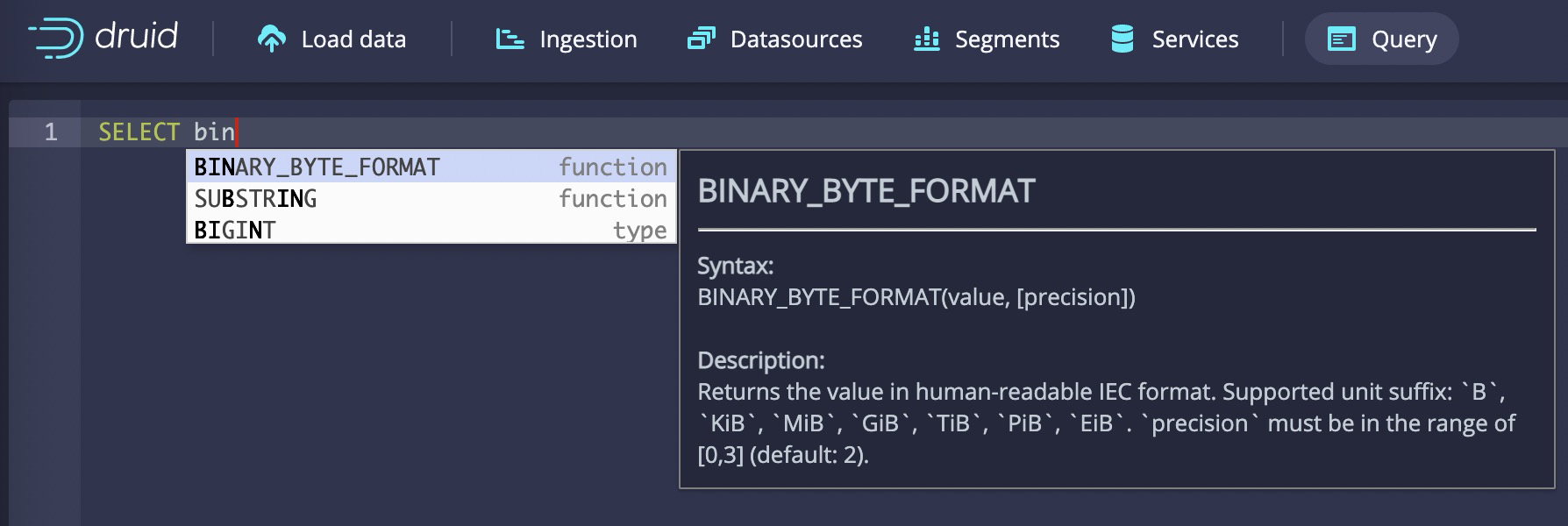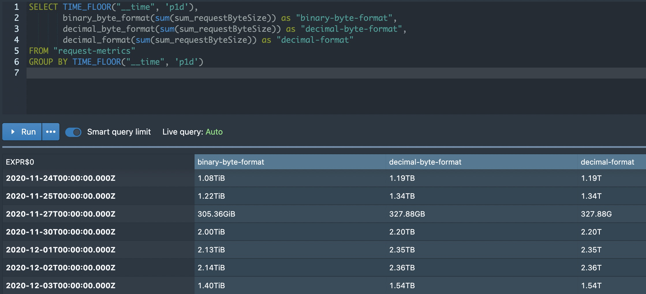 This PR implements requirements described in #10584 In this PR, 3 SQL functions and 3 corresponding native functions are provided to format numbers to different style. | SQL/Native function | Description | | --- | --- | | binary_byte_format(value[, precision]) | Returns the value in human-readable [IEC](https://en.wikipedia.org/wiki/Binary_prefix) format. Supported unit suffix: `B`, `KiB`, `MiB`, `GiB`, `TiB`, `PiB`, `EiB`. `precision` must be in the range of [0,3] (default: 2). | | decimal_byte_format(value[, precision]) | Returns the value in human-readable [SI](https://en.wikipedia.org/wiki/Binary_prefix) format. Supported unit suffix: `B`, `KB`, `MB`, `GB`, `TB`, `PB`, `EB`. `precision` must be in the range of [0,3] (default: 2). | | decimal_format(value[, precision]) | Returns the value in human-readable SI format. Supported unit suffix: `K`, `M`, `G`, `T`, `P`, `E`. `precision` must be in the range of [0,3] (default: 2). | The reason why 3 functions are provided to user instead of 1 function with different argument of format is that we think it's more simpler for a user to call these function. However in internal implementation, there's only one public format function exposed for all 3 format. We've tested this feature in our clusters, and it works as we expect.  Web Console has also been verified   <hr> This PR has: - [X] been self-reviewed. - [X] added documentation for new or modified features or behaviors. - [X] added Javadocs for most classes and all non-trivial methods. Linked related entities via Javadoc links. - [ ] added or updated version, license, or notice information in [licenses.yaml](https://github.com/apache/druid/blob/master/licenses.yaml) - [X] added comments explaining the "why" and the intent of the code wherever would not be obvious for an unfamiliar reader. - [X] added unit tests or modified existing tests to cover new code paths, ensuring the threshold for [code coverage](https://github.com/apache/druid/blob/master/dev/code-review/code-coverage.md) is met. - [ ] added integration tests. - [X] been tested in a test Druid cluster. ---------------------------------------------------------------- This is an automated message from the Apache Git Service. To respond to the message, please log on to GitHub and use the URL above to go to the specific comment. For queries about this service, please contact Infrastructure at: [email protected] --------------------------------------------------------------------- To unsubscribe, e-mail: [email protected] For additional commands, e-mail: [email protected]