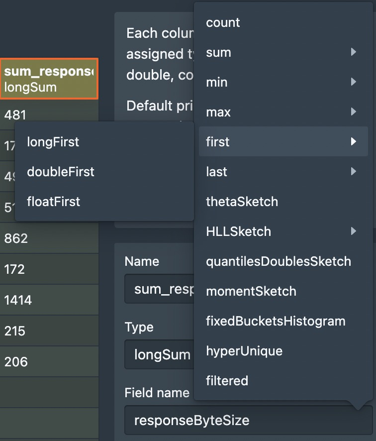> According to the [doc](https://github.com/apache/druid/blame/master/docs/querying/aggregations.md#L137), > > > (Double/Float/Long) First and Last aggregator cannot be used in ingestion spec, and should only be specified as part of queries. > > But the web console DOES allow users to configure a metric aggregated as double/float/long first/last. >  > > And from the current implementation of backend services, these aggregation are not supported. > > I checked the history of code, and didn't find the reasons why these aggregators are not supported during ingestion for rollup. > > Do you have more background information on this problem @gianm ? Thank you for answering my question ---------------------------------------------------------------- This is an automated message from the Apache Git Service. To respond to the message, please log on to GitHub and use the URL above to go to the specific comment. For queries about this service, please contact Infrastructure at: [email protected] --------------------------------------------------------------------- To unsubscribe, e-mail: [email protected] For additional commands, e-mail: [email protected]