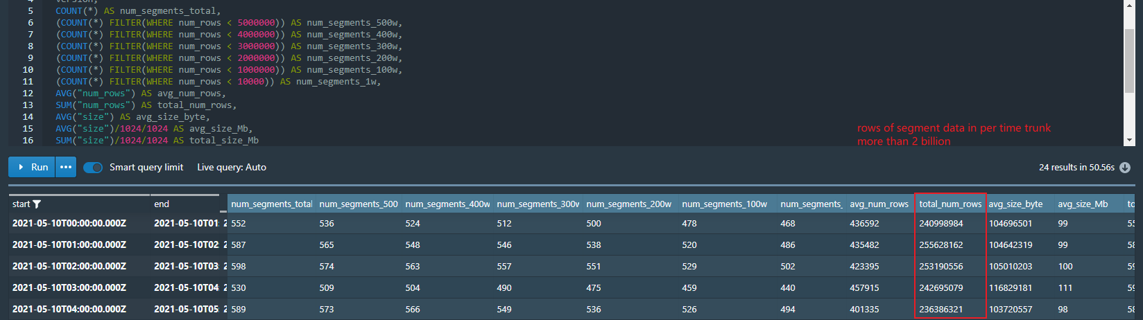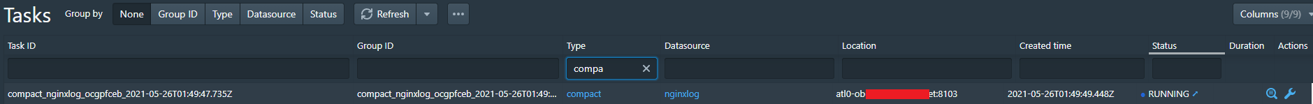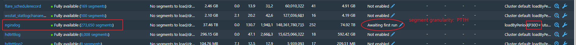 my compaction configs, real segment data to compact as follows, but i can't see any compact task submit     compactionTaskSlotRatio: 0.1, maxCompactionTaskSlots: 2147483647 if I manually submit compaction task spec, it can work   -- This is an automated message from the Apache Git Service. To respond to the message, please log on to GitHub and use the URL above to go to the specific comment. For queries about this service, please contact Infrastructure at: [email protected] --------------------------------------------------------------------- To unsubscribe, e-mail: [email protected] For additional commands, e-mail: [email protected]