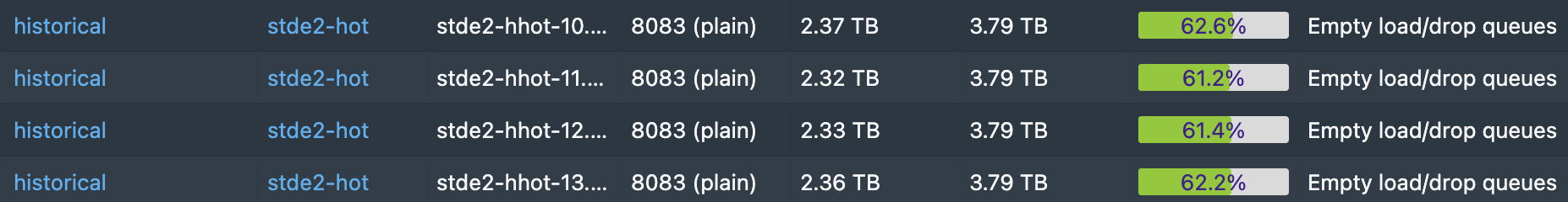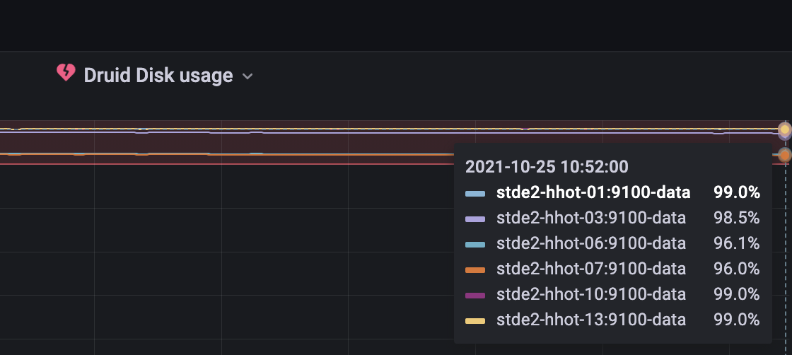 ### Affected Version 0.22.2 ### Description - Cluster size: 2 brokers, 2 routers, 2 coordinators, 37 historicals (15 hot, 21 cold, 1 frozen), 2 overlords, 43 middlemanagers - Steps to reproduce the problem: One morning we found that during the night, a massive rebalanced happened leaving many servers at 100% disk usage while others in the same tier were left empty. After restarting the coordinator segments were better balanced but we started noticing this issue. Many servers in two different tiers had their disks full while reporting not being full. Coordinator log: ``` Oct 25 08:59:53 druid-master-1 java[19246]: 2021-10-25T08:59:53,185 ERROR [Master-PeonExec--0] org.apache.druid.server.coordinator.HttpLoadQueuePeon - Server[http://stde2-hhot-10.stde2] Failed segment[datasource_2021-09-04T11:00:00.000Z_2021-09-04T12:00:00.000Z_2021-09-04T11:00:00.016Z_226] request[SegmentChangeRequestLoad] with cause [Exception loading segment[datasource_2021-09-04T11:00:00.000Z_2021-09-04T12:00:00.000Z_2021-09-04T11:00:00.016Z_226]]. Oct 25 08:59:53 druid-master-1 java[19246]: 2021-10-25T08:59:53,475 ERROR [Master-PeonExec--0] org.apache.druid.server.coordinator.HttpLoadQueuePeon - Server[http://stde2-hhot-01.stde2] Failed segment[datasource_2021-08-31T19:00:00.000Z_2021-08-31T20:00:00.000Z_2021-08-31T19:00:00.019Z_449] request[SegmentChangeRequestLoad] with cause [Exception loading segment[datasource_2021-08-31T19:00:00.000Z_2021-08-31T20:00:00.000Z_2021-08-31T19:00:00.019Z_449]]. Oct 25 08:59:55 druid-master-1 java[19246]: 2021-10-25T08:59:55,918 ERROR [Master-PeonExec--0] org.apache.druid.server.coordinator.HttpLoadQueuePeon - Server[http://stde2-hhot-01.stde2] Failed segment[datasource_2021-10-24T17:00:00.000Z_2021-10-24T18:00:00.000Z_2021-10-24T17:00:00.012Z_339] request[SegmentChangeRequestLoad] with cause [Exception loading segment[datasource_2021-10-24T17:00:00.000Z_2021-10-24T18:00:00.000Z_2021-10-24T17:00:00.012Z_339]]. ```   -- This is an automated message from the Apache Git Service. To respond to the message, please log on to GitHub and use the URL above to go to the specific comment. To unsubscribe, e-mail: [email protected] For queries about this service, please contact Infrastructure at: [email protected] --------------------------------------------------------------------- To unsubscribe, e-mail: [email protected] For additional commands, e-mail: [email protected]