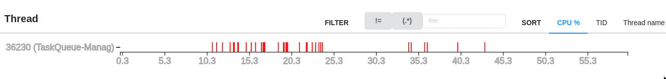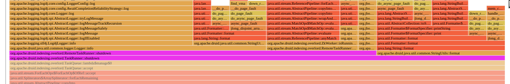 Some extra data, .. With reference to the TaskQueue-Manager thread, a capture with info enabled:  With respect to this thread only, the `TaskRunner::shutdown` call is 82% of CPU in the `manage()` loop, and, the useful part of the loop, `findWorkerRunningTask` consumes ~18%, the rest is logging related. By (1) turning off INFO logging on this path, and (2) avoiding the `StringUtils.format()` call, we get approx 4x more capacity through the `TaskQueue-Manager` thread.  <hr> ie: If you take the image just above ^, and eliminate the `Logger::info` and `StringUtils::format` paths, it opens a lot of capacity through this loop. This becomes more obvious when coupled to #12096 and the yet-to-be-raised PR to reduce contention on the TaskQueue loop. -- This is an automated message from the Apache Git Service. To respond to the message, please log on to GitHub and use the URL above to go to the specific comment. To unsubscribe, e-mail: [email protected] For queries about this service, please contact Infrastructure at: [email protected] --------------------------------------------------------------------- To unsubscribe, e-mail: [email protected] For additional commands, e-mail: [email protected]
