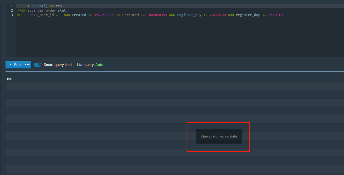 **I found that if the dataset is 0 rows** **The result of count(*) is not 0, but returned no data.**  druid version is 0.20.0 -- This is an automated message from the Apache Git Service. To respond to the message, please log on to GitHub and use the URL above to go to the specific comment. To unsubscribe, e-mail: [email protected] For queries about this service, please contact Infrastructure at: [email protected] --------------------------------------------------------------------- To unsubscribe, e-mail: [email protected] For additional commands, e-mail: [email protected]