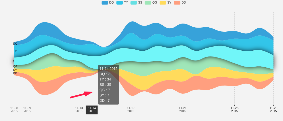 smallyunet commented on issue #10991: themeRiver get all data of the river in the formatter. 主题河流图获取某一河流在所有时间点的数据 URL: https://github.com/apache/incubator-echarts/issues/10991#issuecomment-553430140 Sorry, I didn't clearly describe the problem. As your example, the value of the parameter `name` will not change. I hope that the contents of the hover box can change as the mouse position changes. My trouble is that the theme river map is a single axis, and the parameter param of the `formatter` function can only dynamically get the value of the axis (date). In other words, the parameter value of the function `formatter` can only change with the lateral movement of the mouse, and does not change with the vertical movement of the mouse.  I hope that the content of the floating window in the image can be the data of `SS` at all times, not the data of all rivers in `11-04-2015`. And with the vertical movement of the mouse, the contents of the floating box will display the data of the rivers such as `DQ`, `TY`. The content of the current hover box can only change with the date. This may seem a bit difficult and should be. I just want to make a suggestion and communicate at any time. @deqingli