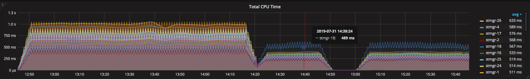 dnrusakov edited a comment on issue #3322: WIP! Optimize hot spots in Stream Manager URL: https://github.com/apache/incubator-heron/pull/3322#issuecomment-517857072 This is the difference in CPU consumption when we were running this PR:  - Running with current master up until 14:20 - Running with --copt=-03 and hopscotch hashmap after 14:20 This chart and testing provided by guys from Heron community. @Aditya and @rohanag12 thank you very much for your help!