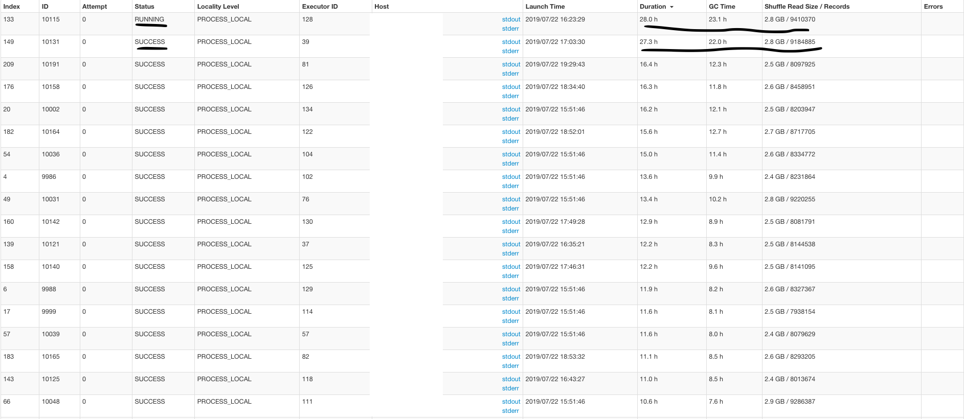 garyli1019 commented on issue #800: Performance tuning URL: https://github.com/apache/incubator-hudi/issues/800#issuecomment-514332156 Sure, I can try that. The delta data was very dirty for sure(many incoming old data need to rewrite existing parquet files). The task duration seems to increase exponentially with the shuffle read size. Also, this job is not releasing executors when the tasks were finished. e.g. I gave this job 100 executors. Two tasks are running for 20 hours and others finished in minutes. This job will keep 100 executors for 20 hours. Is that possible to improve this?