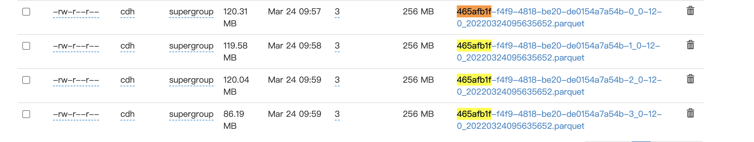 **Describe the problem you faced** BUCKET index upsert and bulk_insert does not compatible or bulk_insert does not Support BUCKET index **To Reproduce** Steps to reproduce the behavior: 1. write history data with bulk_insert & BUCKET index into COW table, use flink 2. flink write data realtime **Environment Description** * Hudi version : 0.11 (master in 2022-03-23 UTC+8) * Flink version : 1.14.3 * Storage (HDFS/S3/GCS..) : HDFS * Running on Docker? (yes/no) : no **Additional context** hdfs file  code file BucketIdentifier.java:65  **Stacktrace** ``` java.lang.NumberFormatException: For input string: "465afb1f" at java.lang.NumberFormatException.forInputString(NumberFormatException.java:65) at java.lang.Integer.parseInt(Integer.java:580) at java.lang.Integer.parseInt(Integer.java:615) at org.apache.hudi.index.bucket.BucketIdentifier.bucketIdFromFileId(BucketIdentifier.java:65) at org.apache.hudi.sink.BucketStreamWriteFunction.bootstrapIndex(BucketStreamWriteFunction.java:152) at org.apache.hudi.sink.BucketStreamWriteFunction.open(BucketStreamWriteFunction.java:87) at org.apache.flink.api.common.functions.util.FunctionUtils.openFunction(FunctionUtils.java:34) at org.apache.flink.streaming.api.operators.AbstractUdfStreamOperator.open(AbstractUdfStreamOperator.java:100) at org.apache.flink.streaming.api.operators.ProcessOperator.open(ProcessOperator.java:56) at org.apache.flink.streaming.runtime.tasks.RegularOperatorChain.initializeStateAndOpenOperators(RegularOperatorChain.java:110) at org.apache.flink.streaming.runtime.tasks.StreamTask.restoreGates(StreamTask.java:711) at org.apache.flink.streaming.runtime.tasks.StreamTaskActionExecutor$1.call(StreamTaskActionExecutor.java:55) at org.apache.flink.streaming.runtime.tasks.StreamTask.restoreInternal(StreamTask.java:687) at org.apache.flink.streaming.runtime.tasks.StreamTask.restore(StreamTask.java:654) at org.apache.flink.runtime.taskmanager.Task.runWithSystemExitMonitoring(Task.java:958) at org.apache.flink.runtime.taskmanager.Task.restoreAndInvoke(Task.java:927) at org.apache.flink.runtime.taskmanager.Task.doRun(Task.java:766) at org.apache.flink.runtime.taskmanager.Task.run(Task.java:575) at java.lang.Thread.run(Thread.java:748) ``` -- This is an automated message from the Apache Git Service. To respond to the message, please log on to GitHub and use the URL above to go to the specific comment. To unsubscribe, e-mail: [email protected] For queries about this service, please contact Infrastructure at: [email protected]