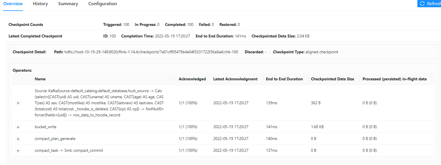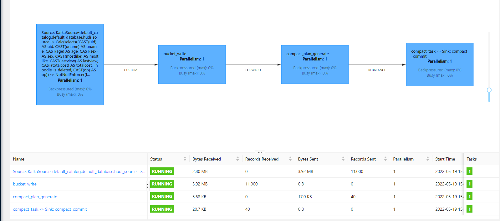 **_Tips before filing an issue_** - Have you gone through our [FAQs](https://hudi.apache.org/learn/faq/)? no - Join the mailing list to engage in conversations and get faster support at [email protected]. - If you have triaged this as a bug, then file an [issue](https://issues.apache.org/jira/projects/HUDI/issues) directly. **Describe the problem you faced** A clear and concise description of the problem. **To Reproduce** Steps to reproduce the behavior: 1. 2. 3. 4. **Expected behavior** A clear and concise description of what you expected to happen. problem 1:flink sql pull data from kafka and write to hudi,there are 11000 records in kafka topic,10000 records are inserts and other 1000 records are updates,enable index global config upsert write operation,select count hudi target table ,there are 10818 records in hudi target table.it seems like upsert operation did not work. problem 2: the last deltacommit did not commit up to now. **Environment Description** * Hudi version : 0.11.0 * Spark version : -- * Hive version : 3.1.2 * Hadoop version : 3.3.0 * Storage (HDFS/S3/GCS..) : hdfs * Running on Docker? (yes/no) : no **Additional context** flink1.14.4 & flink 1.13.5 Add any other context about the problem here. **Stacktrace** ```Add the stacktrace of the error.```       -- This is an automated message from the Apache Git Service. To respond to the message, please log on to GitHub and use the URL above to go to the specific comment. To unsubscribe, e-mail: [email protected] For queries about this service, please contact Infrastructure at: [email protected]