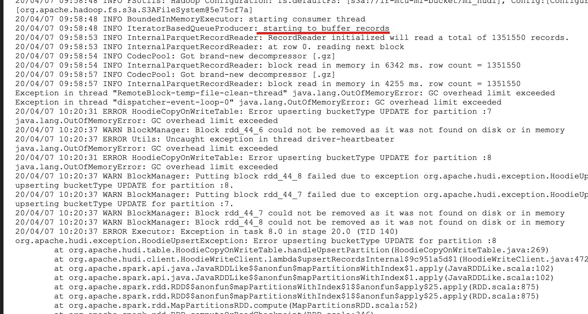 lamber-ken commented on issue #1491: [SUPPORT] OutOfMemoryError during upsert 53M records URL: https://github.com/apache/incubator-hudi/issues/1491#issuecomment-610626104 hi @tverdokhlebd, thanks your detailed spark log, from your description and dataset, key information - run on local machine - the size of each record is large I noticed that OOM happened after parquet read old record to memory, which means we need to control the number of old records, so try add this option ``` .option("hoodie.write.buffer.limit.bytes", "131072") //128MB ```
