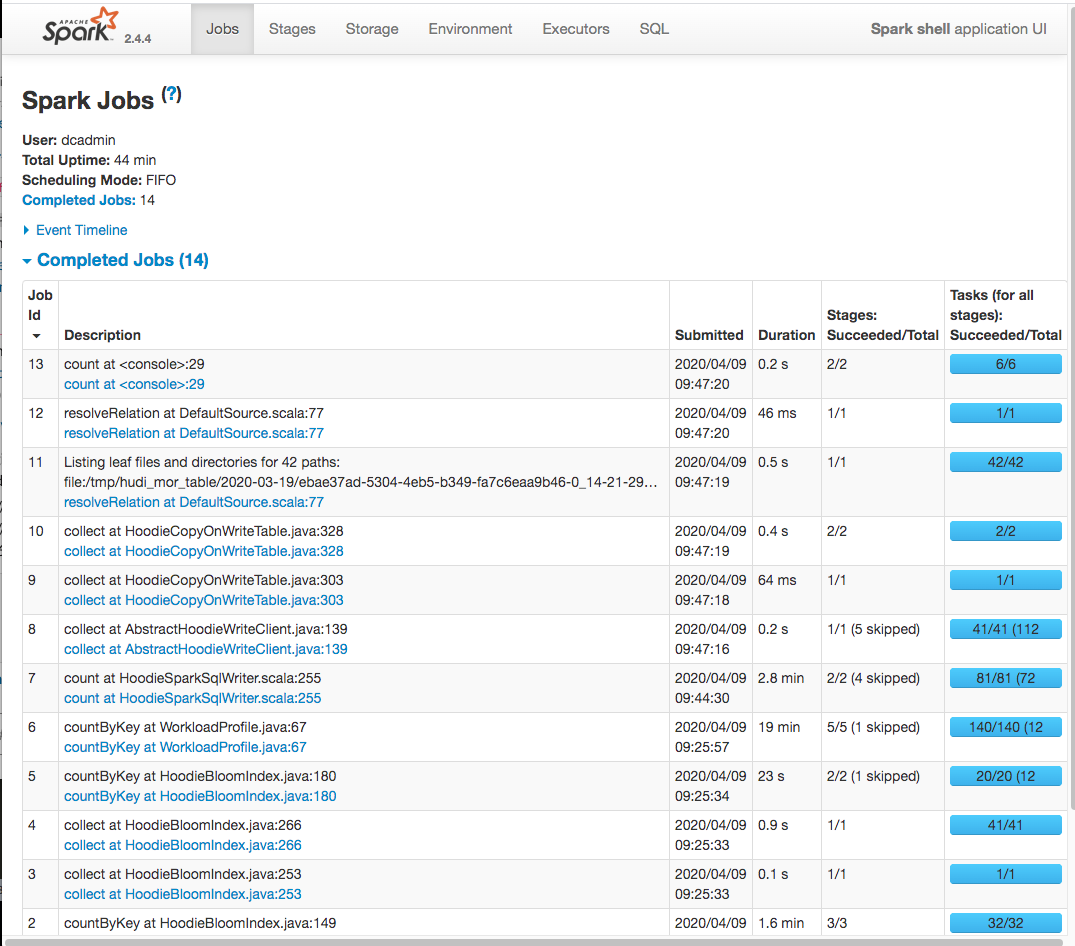 lamber-ken commented on issue #1491: [SUPPORT] OutOfMemoryError during upsert 53M records URL: https://github.com/apache/incubator-hudi/issues/1491#issuecomment-611288468 Hi @tverdokhlebd, the whole upsert cost about 30min ``` dcadmin-imac:hudi-debug dcadmin$ export SPARK_HOME=/work/BigData/install/spark/spark-2.4.4-bin-hadoop2.7 dcadmin-imac:hudi-debug dcadmin$ ${SPARK_HOME}/bin/spark-shell \ > --driver-memory 6G \ > --packages org.apache.hudi:hudi-spark-bundle_2.11:0.5.1-incubating,org.apache.spark:spark-avro_2.11:2.4.4 \ > --conf 'spark.serializer=org.apache.spark.serializer.KryoSerializer' Ivy Default Cache set to: /Users/dcadmin/.ivy2/cache The jars for the packages stored in: /Users/dcadmin/.ivy2/jars :: loading settings :: url = jar:file:/work/BigData/install/spark/spark-2.4.4-bin-hadoop2.7/jars/ivy-2.4.0.jar!/org/apache/ivy/core/settings/ivysettings.xml org.apache.hudi#hudi-spark-bundle_2.11 added as a dependency org.apache.spark#spark-avro_2.11 added as a dependency :: resolving dependencies :: org.apache.spark#spark-submit-parent-204b7ab2-3e3f-4853-9220-5e038fc99fc2;1.0 confs: [default] found org.apache.hudi#hudi-spark-bundle_2.11;0.5.1-incubating in central found org.apache.spark#spark-avro_2.11;2.4.4 in central found org.spark-project.spark#unused;1.0.0 in spark-list :: resolution report :: resolve 258ms :: artifacts dl 5ms :: modules in use: org.apache.hudi#hudi-spark-bundle_2.11;0.5.1-incubating from central in [default] org.apache.spark#spark-avro_2.11;2.4.4 from central in [default] org.spark-project.spark#unused;1.0.0 from spark-list in [default] --------------------------------------------------------------------- | | modules || artifacts | | conf | number| search|dwnlded|evicted|| number|dwnlded| --------------------------------------------------------------------- | default | 3 | 0 | 0 | 0 || 3 | 0 | --------------------------------------------------------------------- :: retrieving :: org.apache.spark#spark-submit-parent-204b7ab2-3e3f-4853-9220-5e038fc99fc2 confs: [default] 0 artifacts copied, 3 already retrieved (0kB/5ms) 20/04/09 09:23:38 WARN NativeCodeLoader: Unable to load native-hadoop library for your platform... using builtin-java classes where applicable Using Spark's default log4j profile: org/apache/spark/log4j-defaults.properties Setting default log level to "WARN". To adjust logging level use sc.setLogLevel(newLevel). For SparkR, use setLogLevel(newLevel). Spark context Web UI available at http://10.101.52.18:4040 Spark context available as 'sc' (master = local[*], app id = local-1586395425370). Spark session available as 'spark'. Welcome to ____ __ / __/__ ___ _____/ /__ _\ \/ _ \/ _ `/ __/ '_/ /___/ .__/\_,_/_/ /_/\_\ version 2.4.4 /_/ Using Scala version 2.11.12 (Java HotSpot(TM) 64-Bit Server VM, Java 1.8.0_211) Type in expressions to have them evaluated. Type :help for more information. scala> scala> import org.apache.spark.sql.functions._ import org.apache.spark.sql.functions._ scala> scala> val tableName = "hudi_mor_table" tableName: String = hudi_mor_table scala> val basePath = "file:///tmp/hudi_mor_table" basePath: String = file:///tmp/hudi_mor_table scala> scala> var inputDF = spark.read.format("csv").option("header", "true").load("file:///work/hudi-debug/2.csv") inputDF: org.apache.spark.sql.DataFrame = [tds_cid: string, hit_timestamp: string ... 46 more fields] scala> scala> val hudiOptions = Map[String,String]( | "hoodie.insert.shuffle.parallelism" -> "10", | "hoodie.upsert.shuffle.parallelism" -> "10", | "hoodie.delete.shuffle.parallelism" -> "10", | "hoodie.bulkinsert.shuffle.parallelism" -> "10", | "hoodie.datasource.write.recordkey.field" -> "tds_cid", | "hoodie.datasource.write.partitionpath.field" -> "hit_date", | "hoodie.table.name" -> tableName, | "hoodie.datasource.write.precombine.field" -> "hit_timestamp", | "hoodie.datasource.write.operation" -> "upsert", | "hoodie.memory.merge.max.size" -> "2004857600000", | "hoodie.cleaner.policy" -> "KEEP_LATEST_FILE_VERSIONS", | "hoodie.cleaner.fileversions.retained" -> "1" | ) hudiOptions: scala.collection.immutable.Map[String,String] = Map(hoodie.insert.shuffle.parallelism -> 10, hoodie.datasource.write.precombine.field -> hit_timestamp, hoodie.cleaner.fileversions.retained -> 1, hoodie.delete.shuffle.parallelism -> 10, hoodie.datasource.write.operation -> upsert, hoodie.datasource.write.recordkey.field -> tds_cid, hoodie.table.name -> hudi_mor_table, hoodie.memory.merge.max.size -> 2004857600000, hoodie.cleaner.policy -> KEEP_LATEST_FILE_VERSIONS, hoodie.upsert.shuffle.parallelism -> 10, hoodie.datasource.write.partitionpath.field -> hit_date, hoodie.bulkinsert.shuffle.parallelism -> 10) scala> scala> inputDF.write.format("org.apache.hudi"). | options(hudiOptions). | mode("Append"). | save(basePath) 20/04/09 09:23:53 WARN Utils: Truncated the string representation of a plan since it was too large. This behavior can be adjusted by setting 'spark.debug.maxToStringFields' in SparkEnv.conf. [Stage 3:> (0 + 4) / 10]20/04/09 09:24:55 WARN MemoryStore: Not enough space to cache rdd_16_1 in memory! (computed 87.6 MB so far) 20/04/09 09:24:55 WARN BlockManager: Persisting block rdd_16_1 to disk instead. 20/04/09 09:24:56 WARN MemoryStore: Not enough space to cache rdd_16_2 in memory! (computed 196.9 MB so far) 20/04/09 09:24:56 WARN BlockManager: Persisting block rdd_16_2 to disk instead. 20/04/09 09:24:56 WARN MemoryStore: Not enough space to cache rdd_16_0 in memory! (computed 130.8 MB so far) 20/04/09 09:24:56 WARN BlockManager: Persisting block rdd_16_0 to disk instead. 20/04/09 09:24:56 WARN MemoryStore: Not enough space to cache rdd_16_3 in memory! (computed 196.3 MB so far) 20/04/09 09:24:56 WARN BlockManager: Persisting block rdd_16_3 to disk instead. [Stage 3:=======================> (4 + 4) / 10]20/04/09 09:25:12 WARN MemoryStore: Not enough space to cache rdd_16_6 in memory! (computed 58.5 MB so far) 20/04/09 09:25:12 WARN BlockManager: Persisting block rdd_16_6 to disk instead. 20/04/09