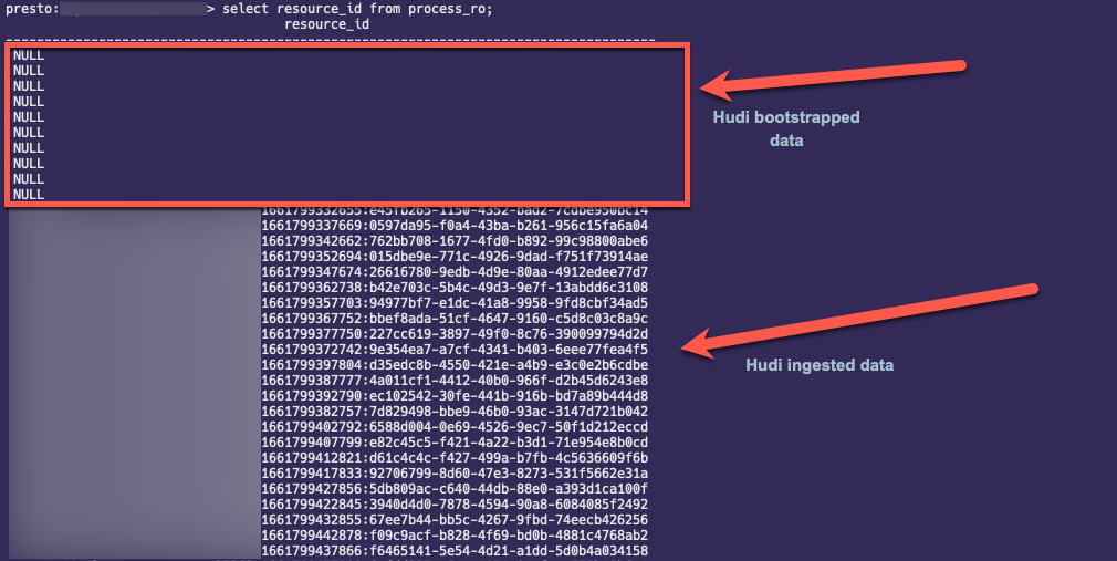 **Describe the problem you faced** **To Reproduce** Steps to reproduce the behavior: 1. Bootstrap legacy partition using hudi bootstrap using delta streamer 2. Query the bootstrapped partition using presto with hudi connector  **Expected behavior** Should returns results for the bootstrapped partition **Environment Description** * Hudi version : 0.11.1 * Presto version: 0.275 ( hudi plugin version default 0.11) * Spark version : 3.1.2 * Hive version : 3.1.2 * Hadoop version : 3.2.2 * Storage (HDFS/S3/GCS..) : HDFS * Running on Docker? (yes/no) : yes **Additional context** * This issue seems to be only for bootstrapped data. Data ingested with hudi using delta streamer is returned without any issue.  * Querying bootstrapped data directly on Hive returns the result with out any issue  **Stacktrace** ```Add the stacktrace of the error.``` -- This is an automated message from the Apache Git Service. To respond to the message, please log on to GitHub and use the URL above to go to the specific comment. To unsubscribe, e-mail: [email protected] For queries about this service, please contact Infrastructure at: [email protected]