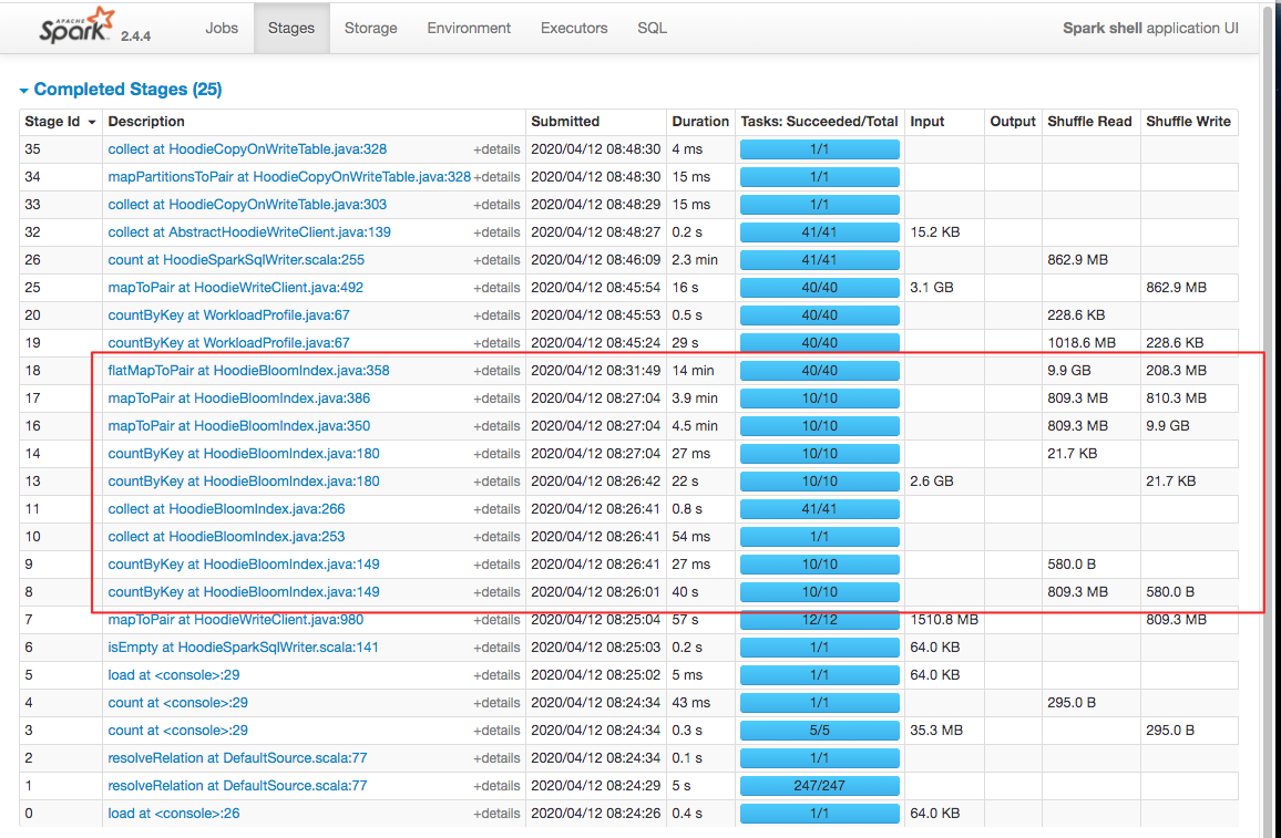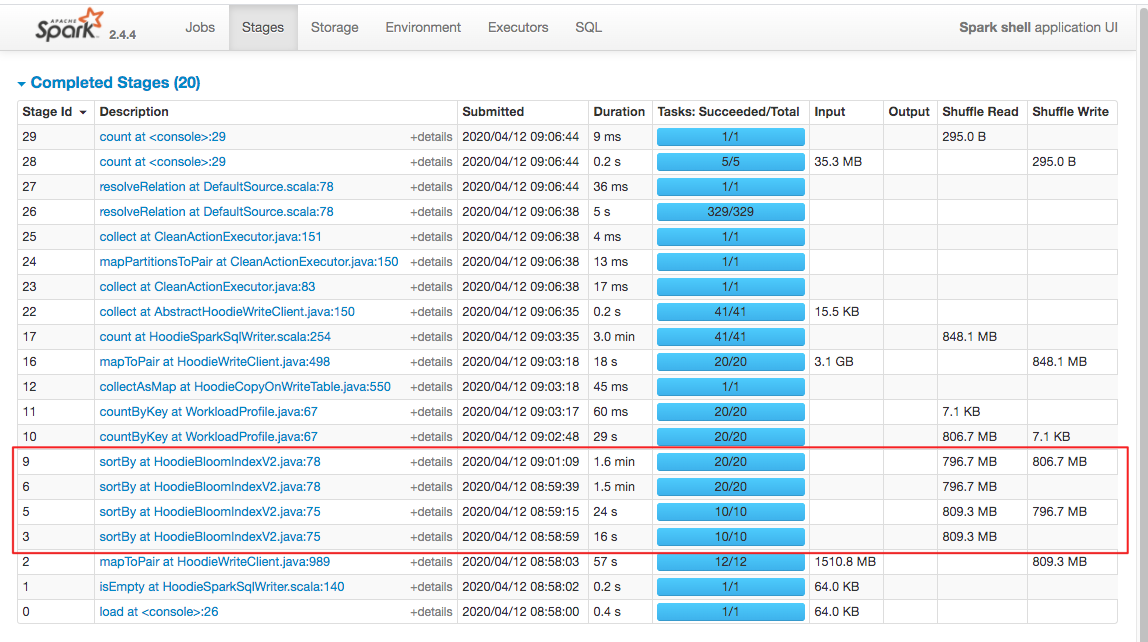 lamber-ken commented on issue #1469: [HUDI-686] Implement BloomIndexV2 that does not depend on memory caching URL: https://github.com/apache/incubator-hudi/pull/1469#issuecomment-612546567 > understood :).. but I am saying the difference you see is outside the indexing piece.. Can you post the stages UI? Got, let me show you the spark stage page, amazing 👍. From the ui, we can see that time-consuming, shuffle write, shuffle read are better. BTW, env: 4core, 6GB driver, local mode, don't forget `"hoodie.index.type" -> "BLOOM_V2"` #### `HoodieBloomIndex`: cost about 20min  #### `HoodieBloomIndexV2`: cost about 3min